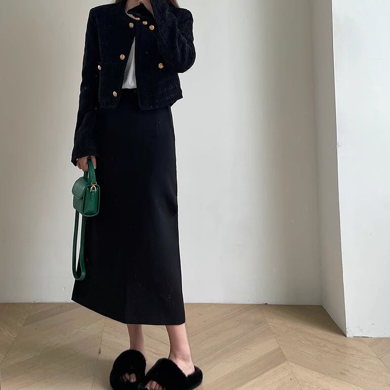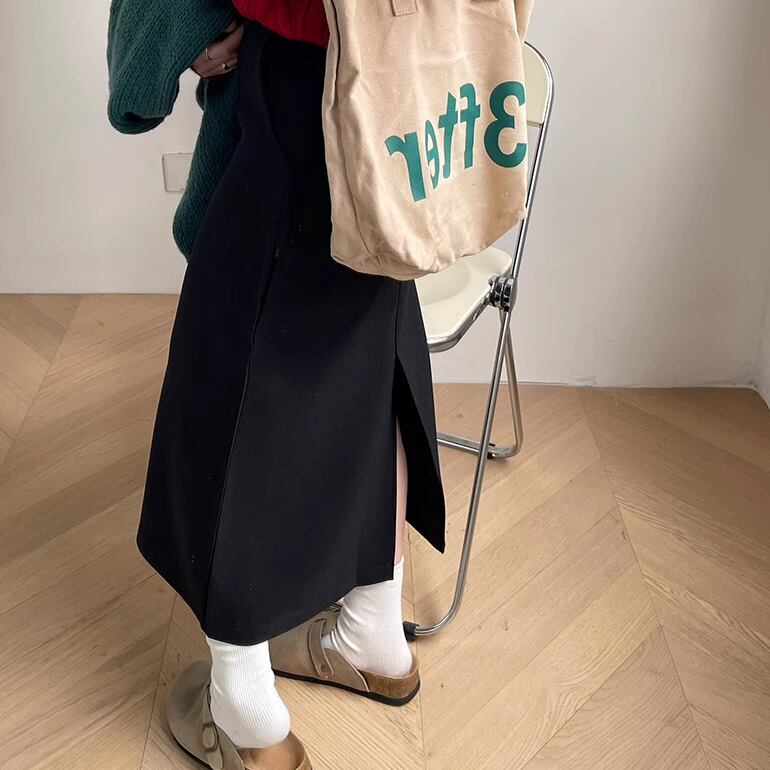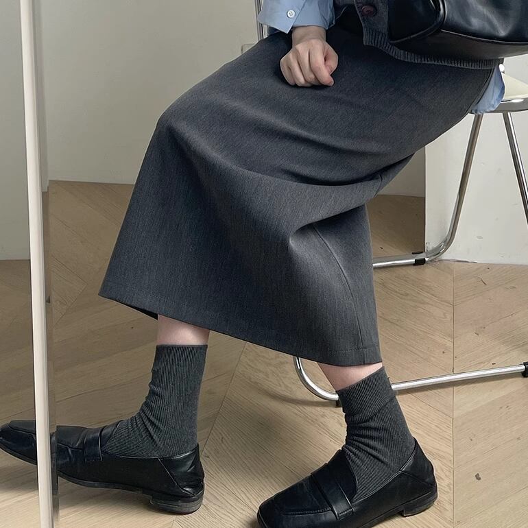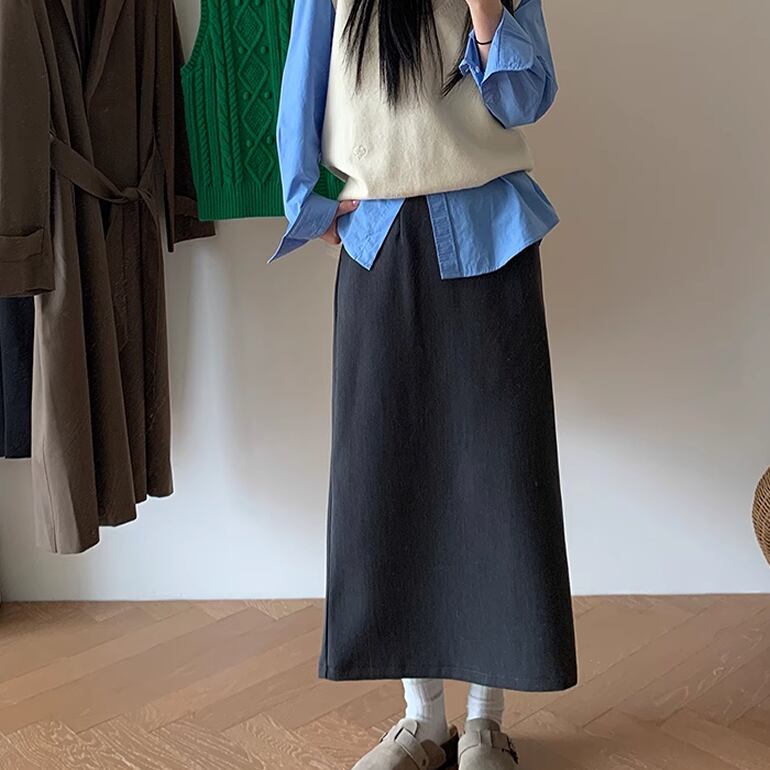 シンプルなデザインで合わせるアイテムを選ばず、オンオフで着回せるスカートです。