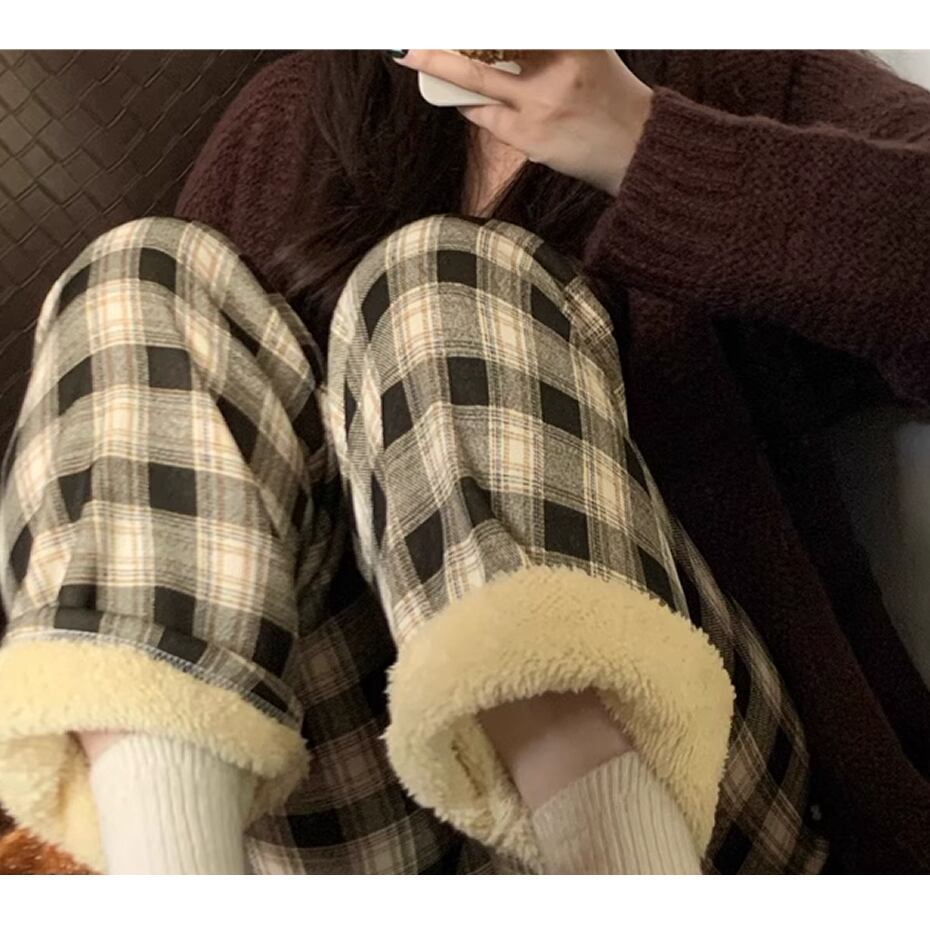 レディース チェック柄 パンツ レトロ 裏ボア レッド ピンク グリーン ブラック AS10596