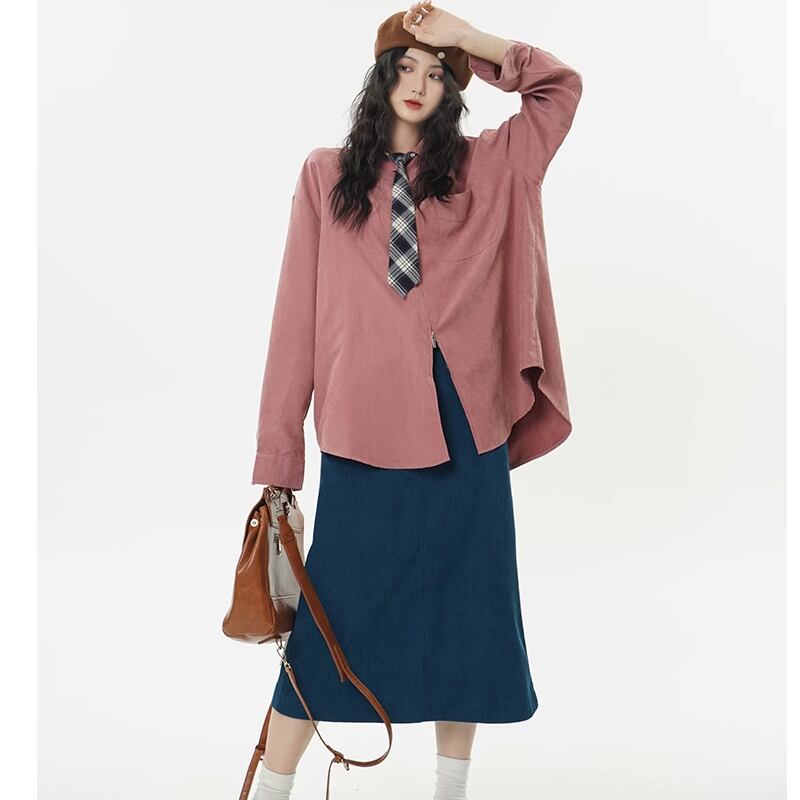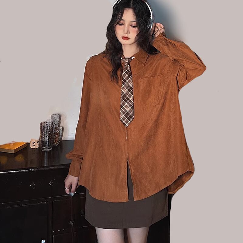 レディース フロントジップ シャツ ネクタイ付き 長袖 レトロ オーバーサイズ M L XL ホワイト ブルー ピンク ブラウン AS10597