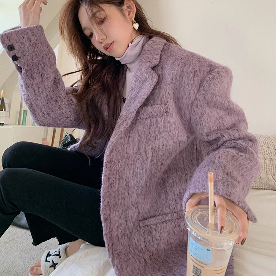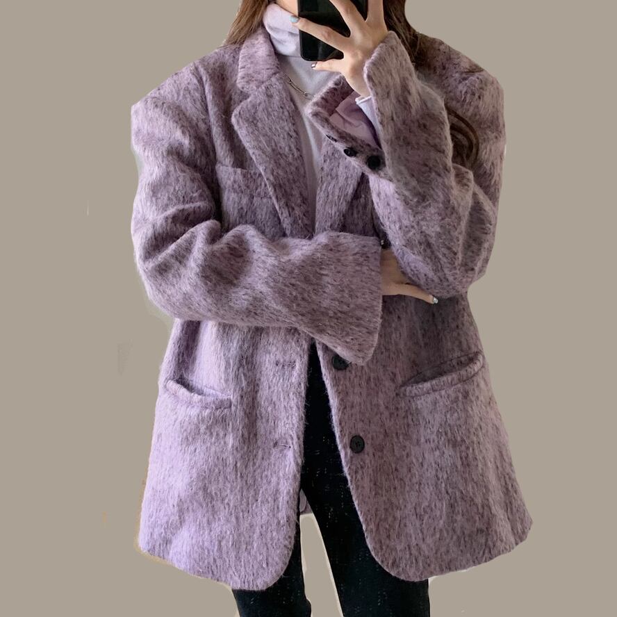 上品感のあるパープルのジャケット。