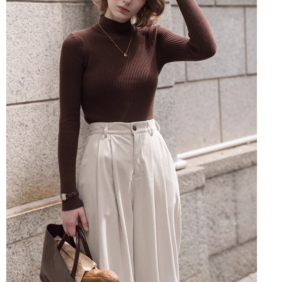 どんなコーデにも合わせやすいハイネックのニットトップス。