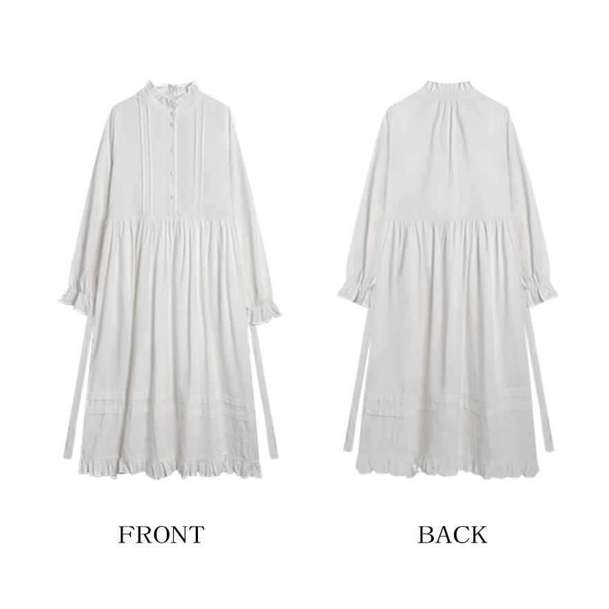 レディース フリル レトロ ワンピース ロング丈 スタンドカラー 長袖 S M 白 ホワイト AS10614