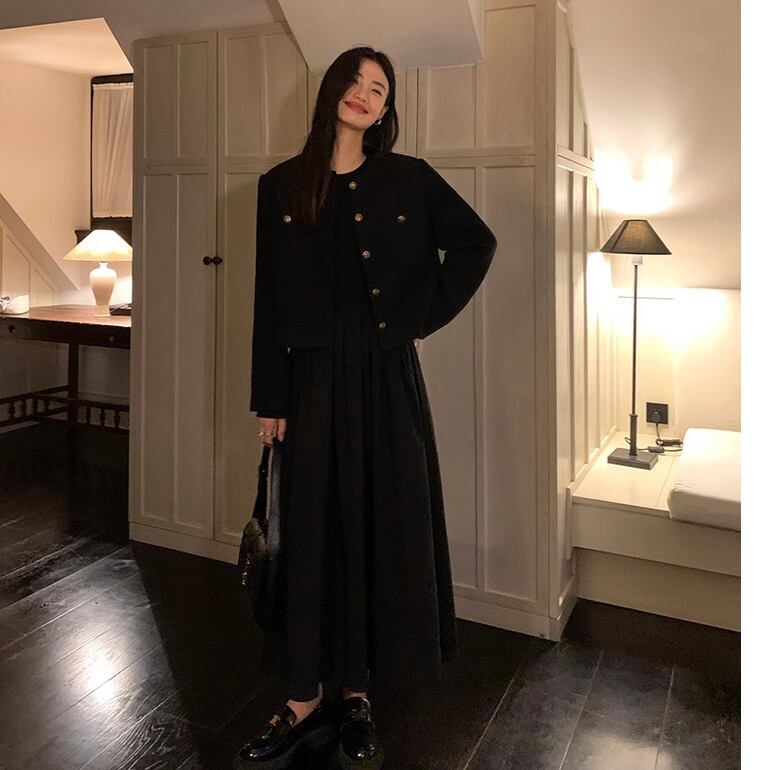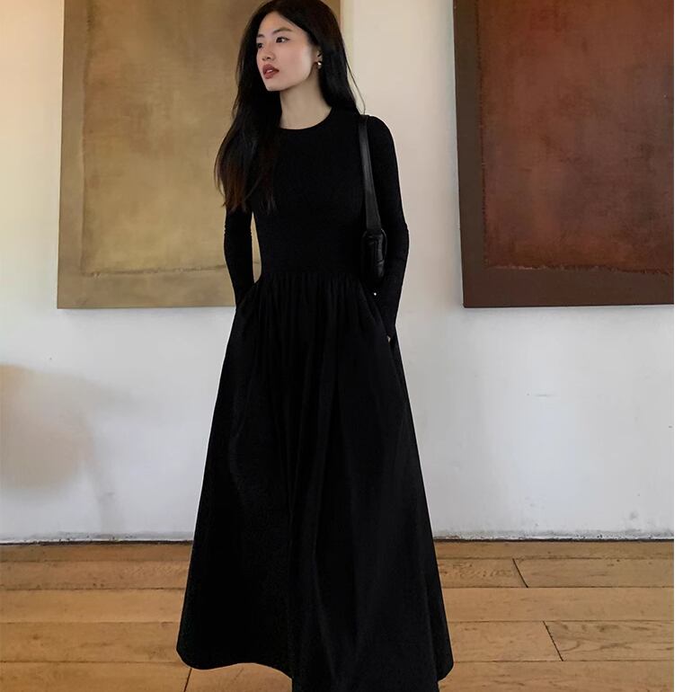 レディース ワンピース ロング丈 タイト シンプル フレアスカート S M L 黒 ブラック AS10622