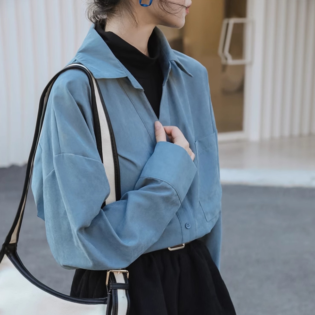 レディース ドッキング シャツ トップス 長袖 ハイネック S M L XL ブルー アプリコット ブラウン AS10627