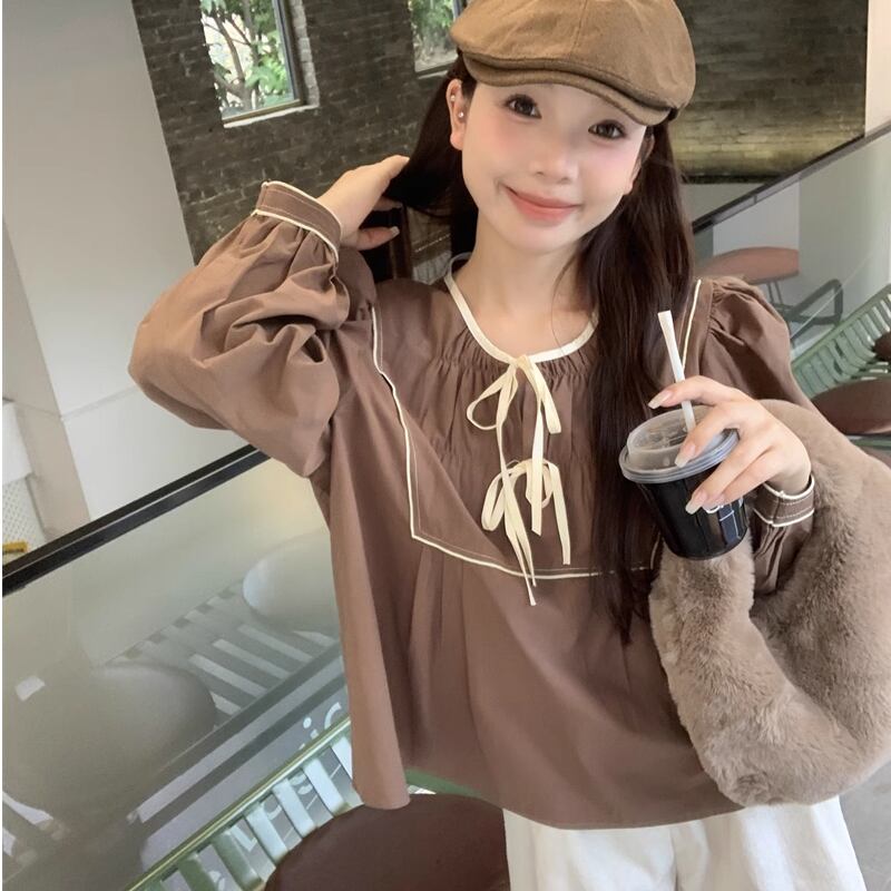 レディース リボン 長袖 ブラウス ガーリー ブラック ブラウン ホワイト AS10629