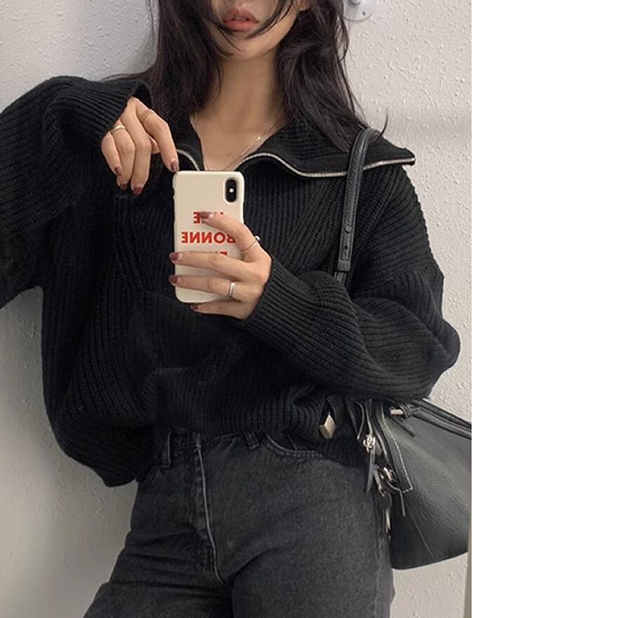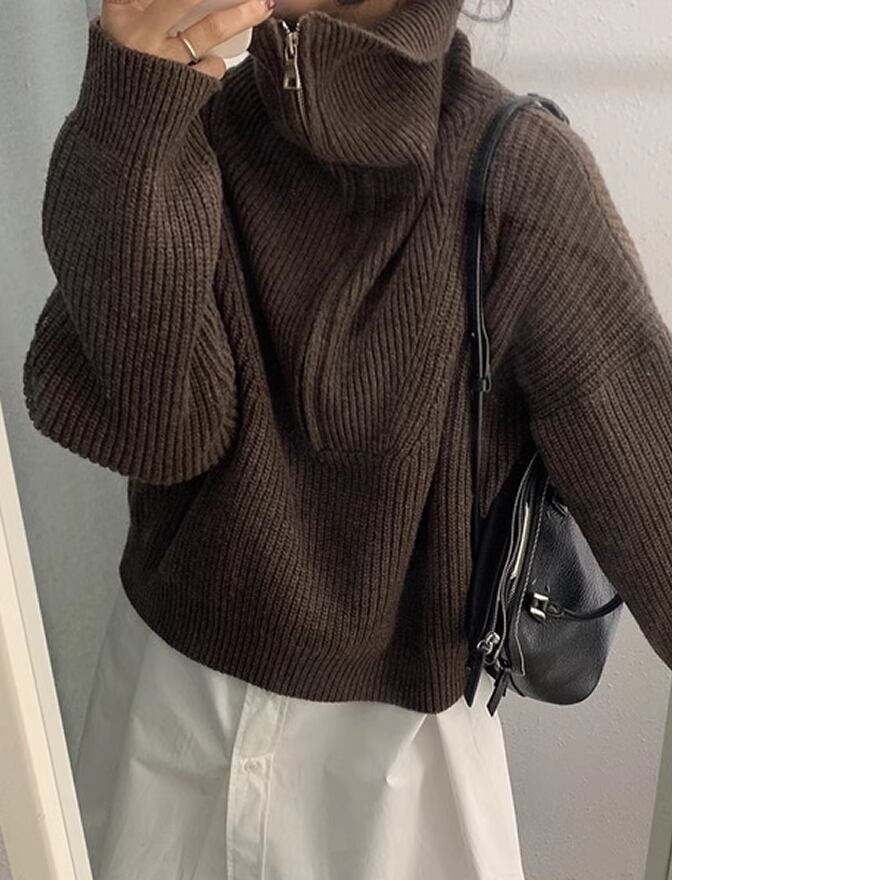 レディース ハーフジップ ニット ショート丈 セーター アプリコット ブラック ブラウン AS10656