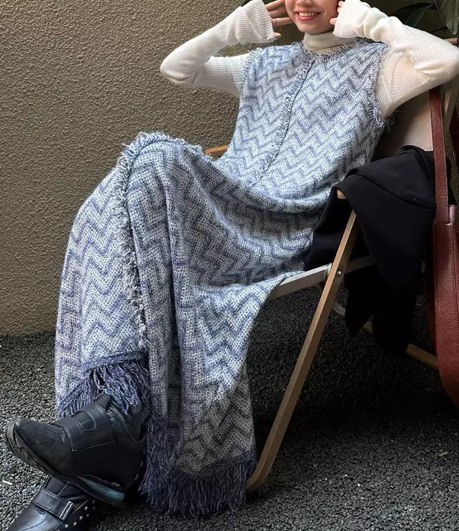 レディース ニット ワンピース ノースリーブ ウエーブストライプ フリンジ ロングワンピース 2Collar KS10299