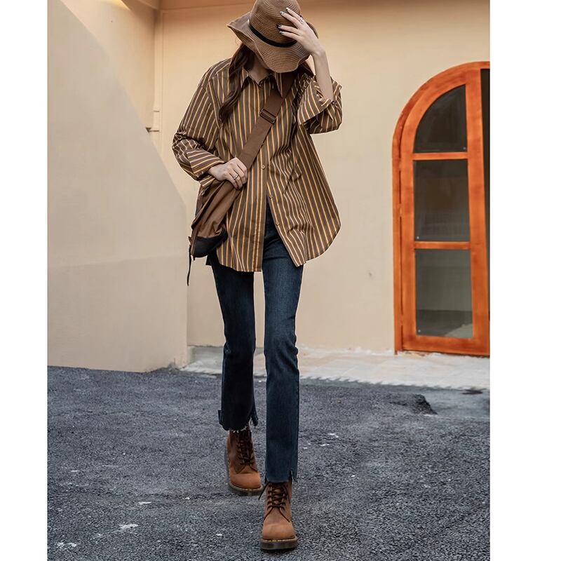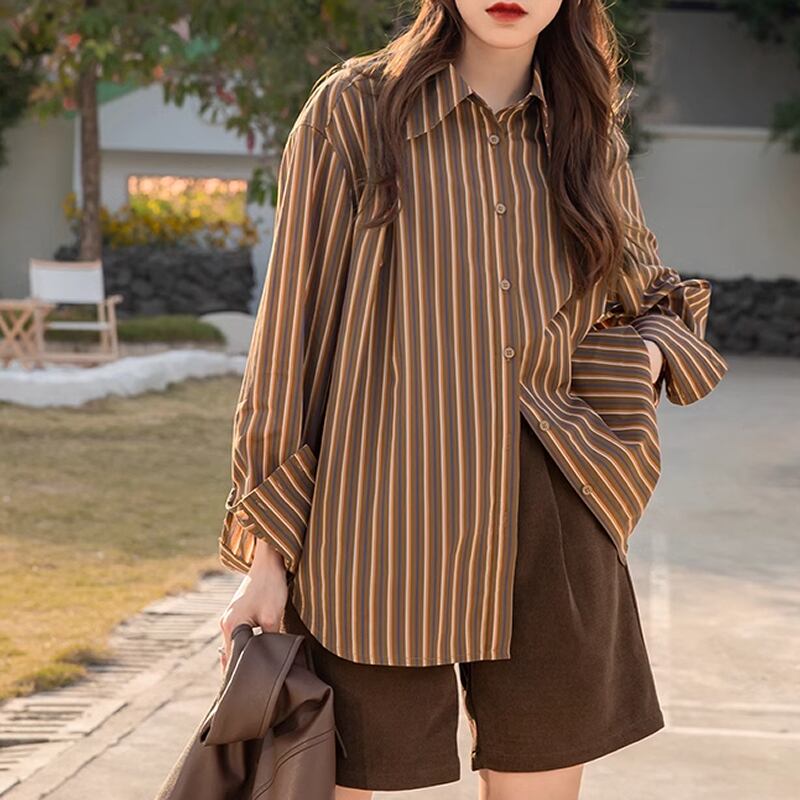 レディース ストライプ シャツ 長袖 レトロ S M 茶 ブラウン AS10670