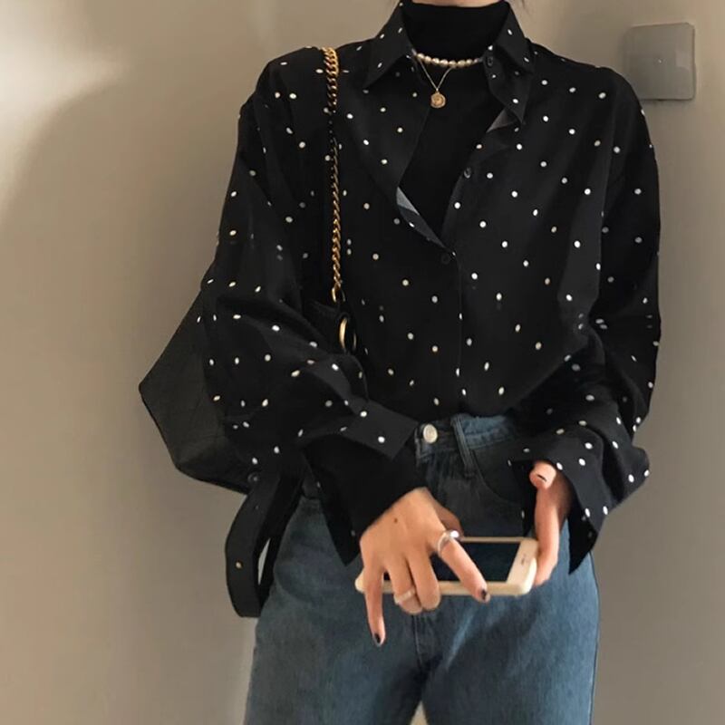 レディース ドット柄 長袖 シャツ 水玉 ブラック 黒 AS10676