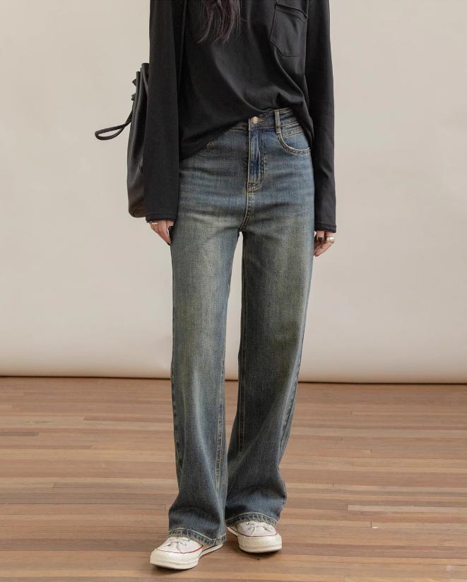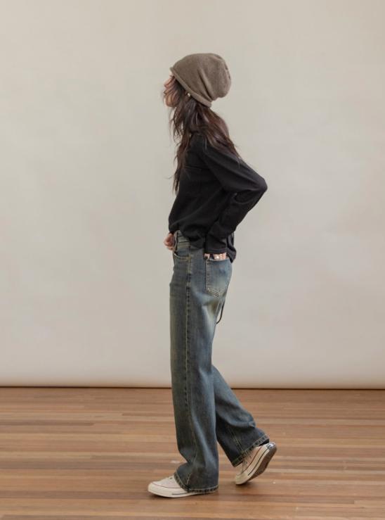 レディース ヴィンテージ カラー ルーズ デニム ハイウエスト ストレート カジュアル ジーンズ 2Collar KS10313