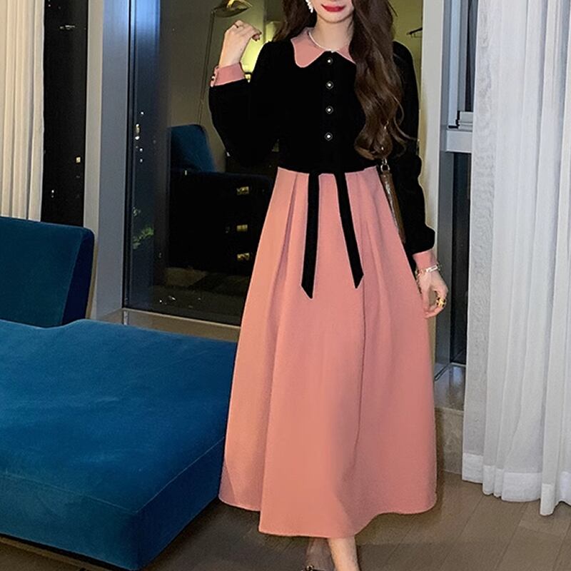 レディース ベルベット ワンピース ロング丈 バイカラー 長袖 フリル S M L 黒 ブラック ピンク AS10701