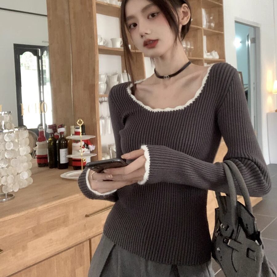 レディース ラウンドネック セーター スリム レトロ ニット ブラック グレー AS10728
