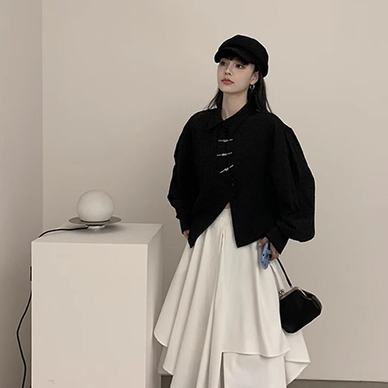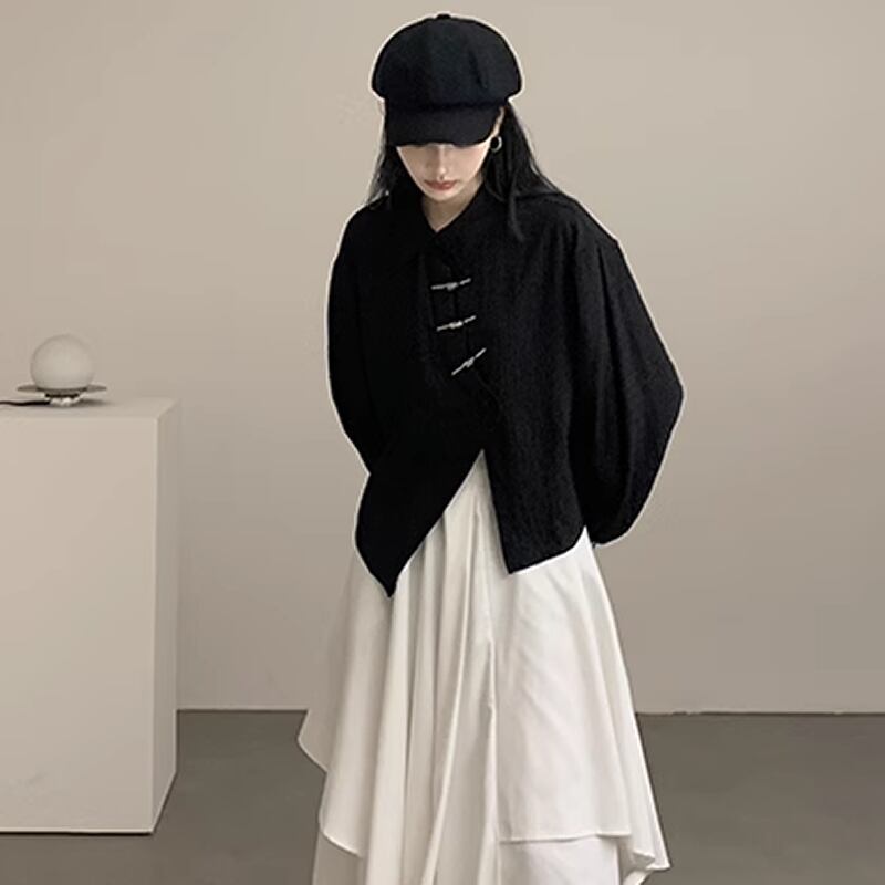 レディース チャイナデザイン シャツ 長袖 襟付き 変形トップス S M 黒 ブラック AS10744