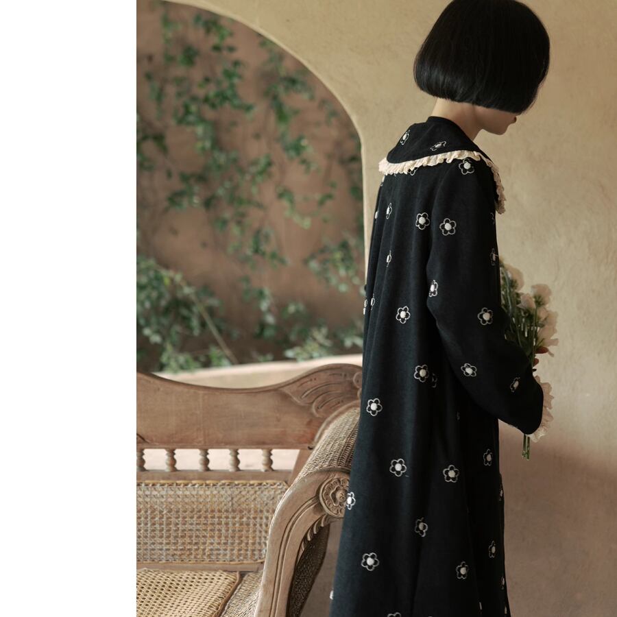 レディース コーデュロイ 花柄 ワンピース 長袖 ロング丈 丸襟 フリル S M ブラック AS10748
