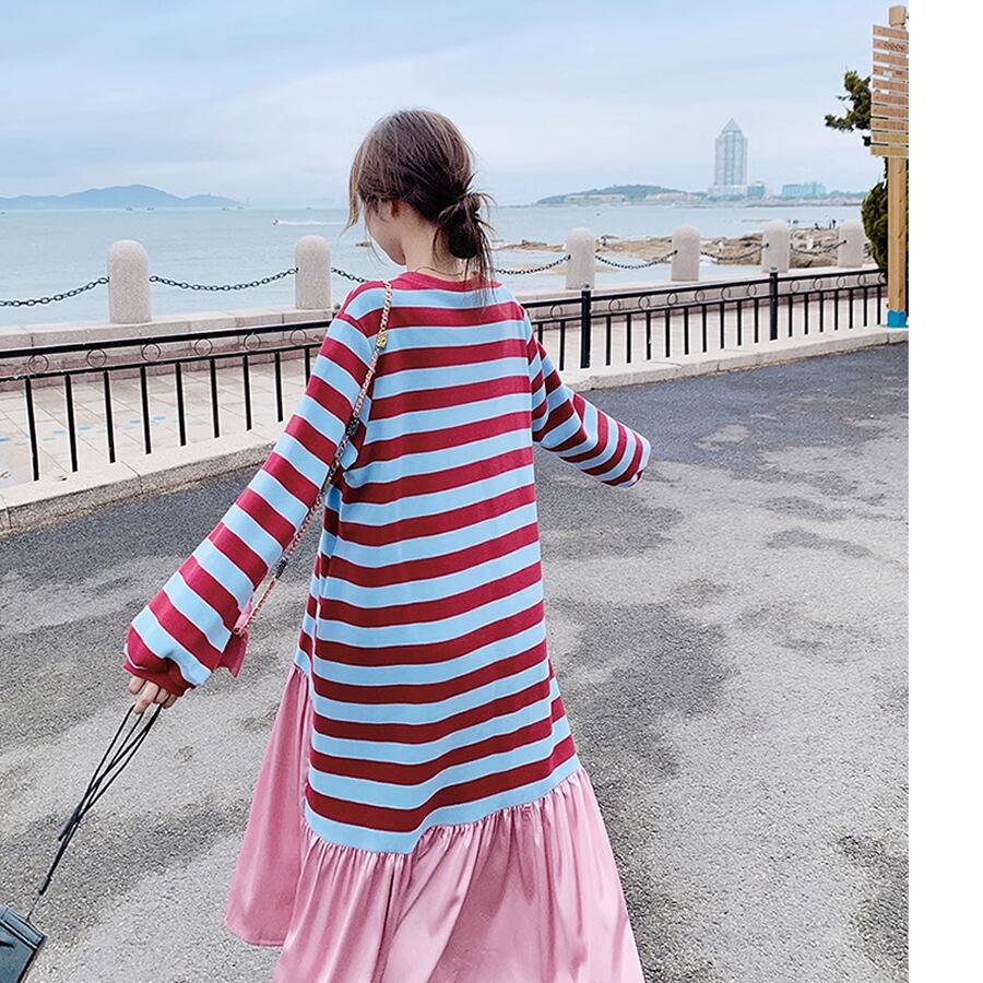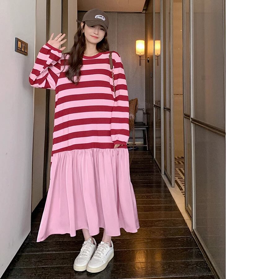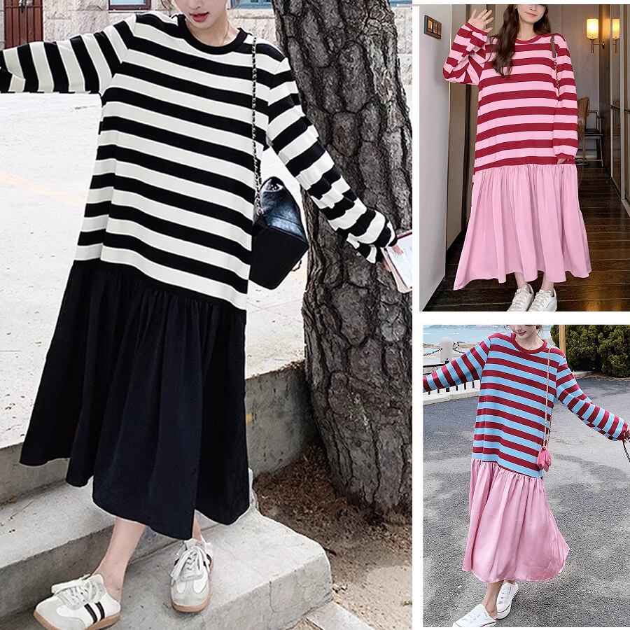 レディース ボーダー ロング丈 ワンピース 長袖 S M L XL ピンク レッド ブラック AS10771