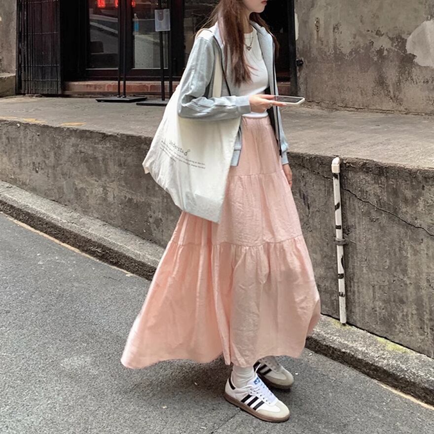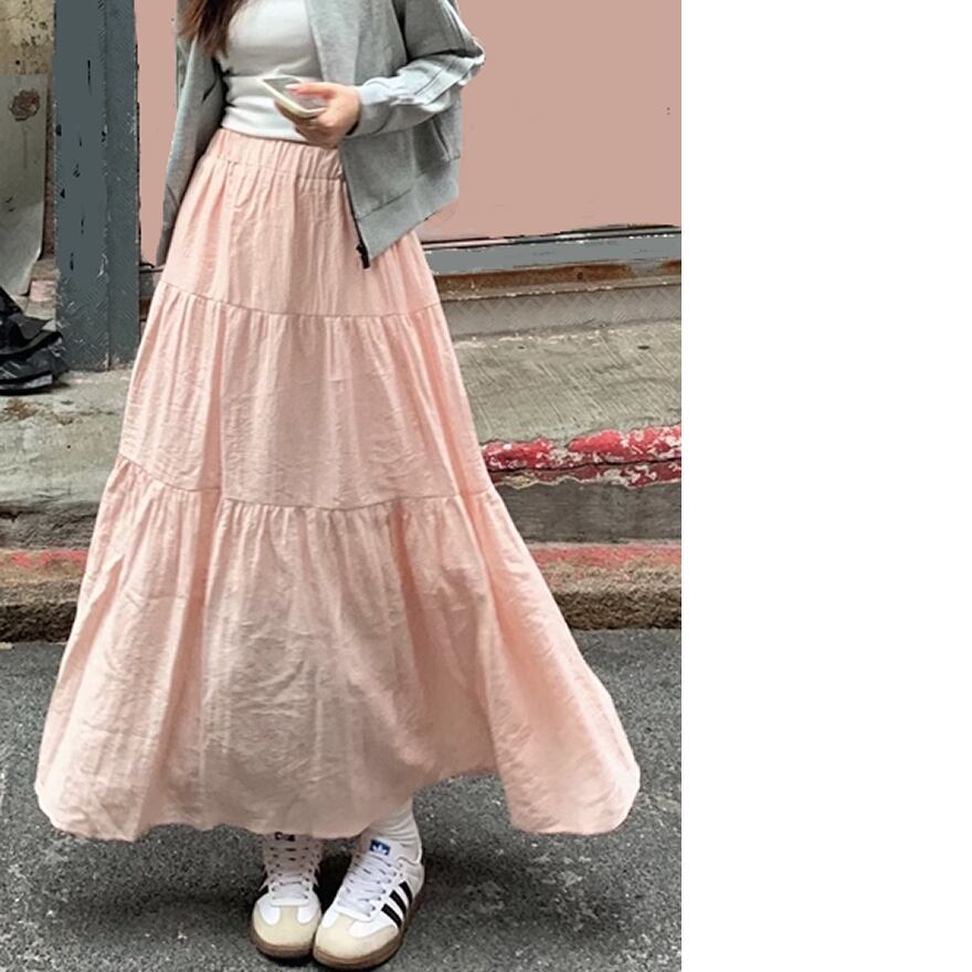 レディース Aライン スカート ロング丈 ハイウエスト ティアード S M ピンク AS10783