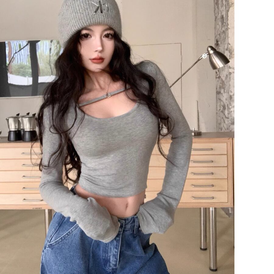 レディース ショート丈 トップス 長袖 フロントチョーカー ブラック グレー AS10797