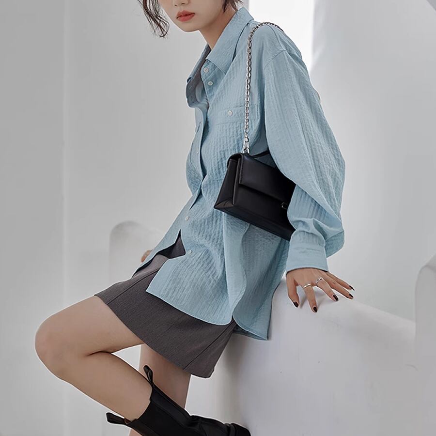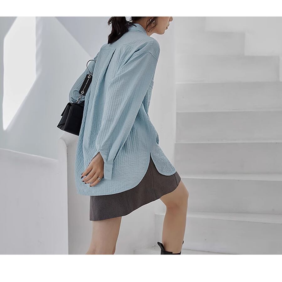 レディース シャツ シンプル レトロ トップス 長袖 S M L 青 ブルー AS10829