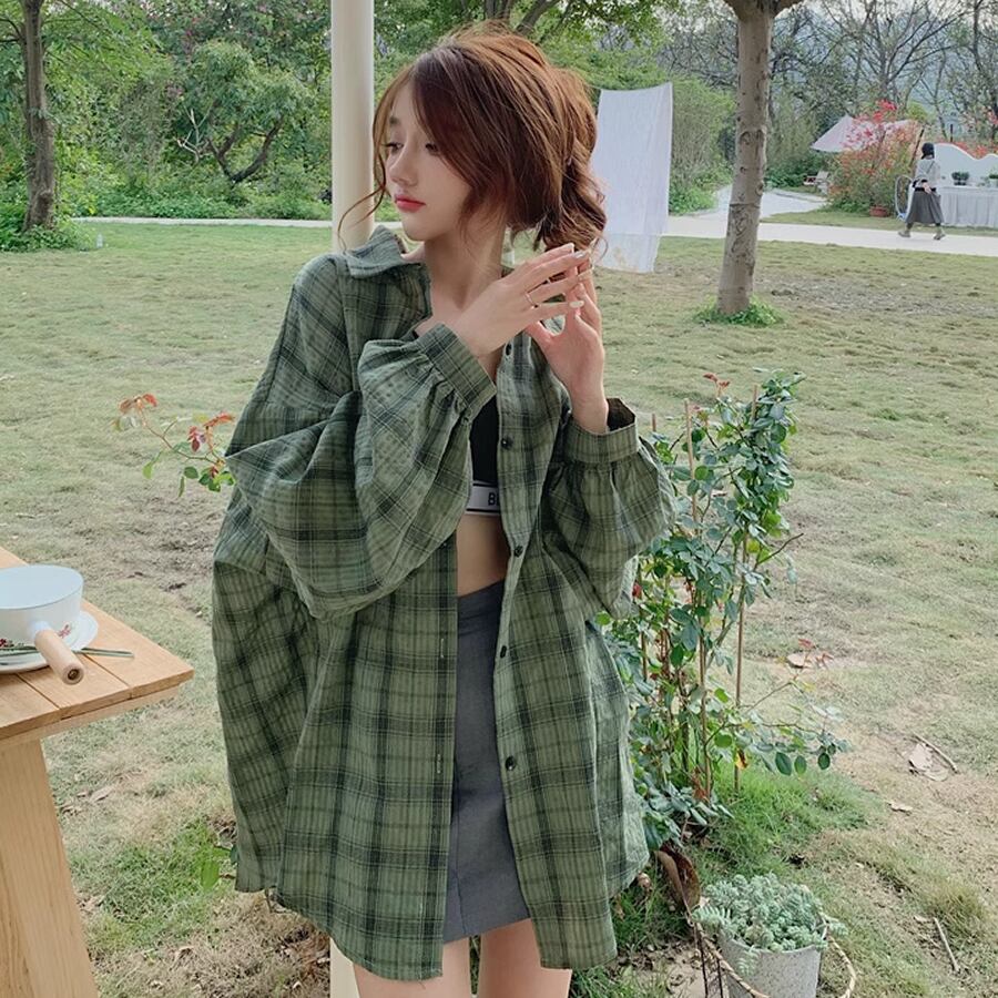 レディース チェック柄 シャツ 長袖 オーバーシルエット レトロ M L XL グリーン ブラウン AS10832