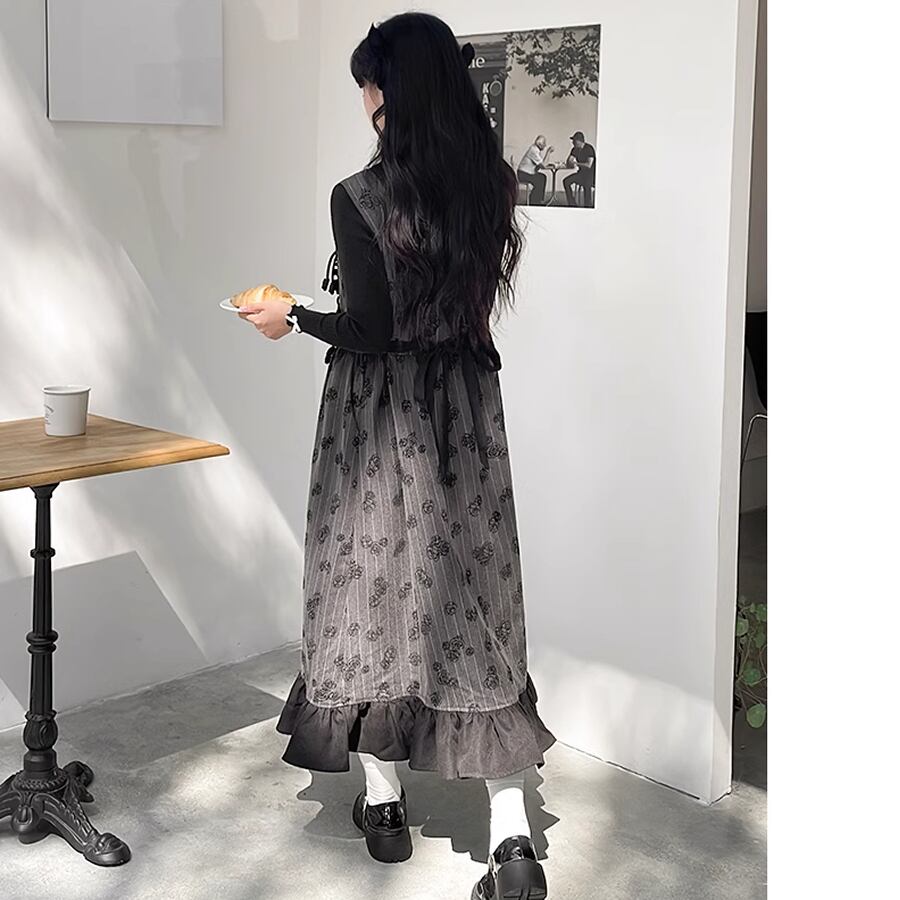 レディース ジャンパースカート レトロ フリル バックリボン バラ柄 花柄 ロング丈 S M L ブラック 黒 AS10837