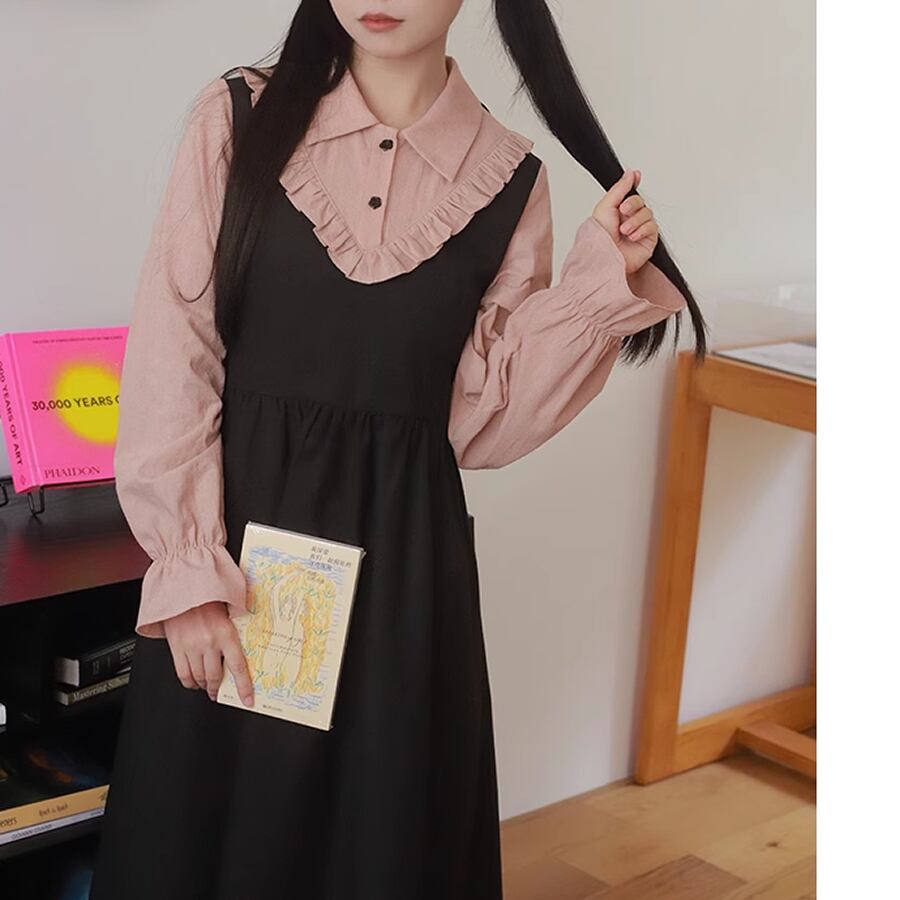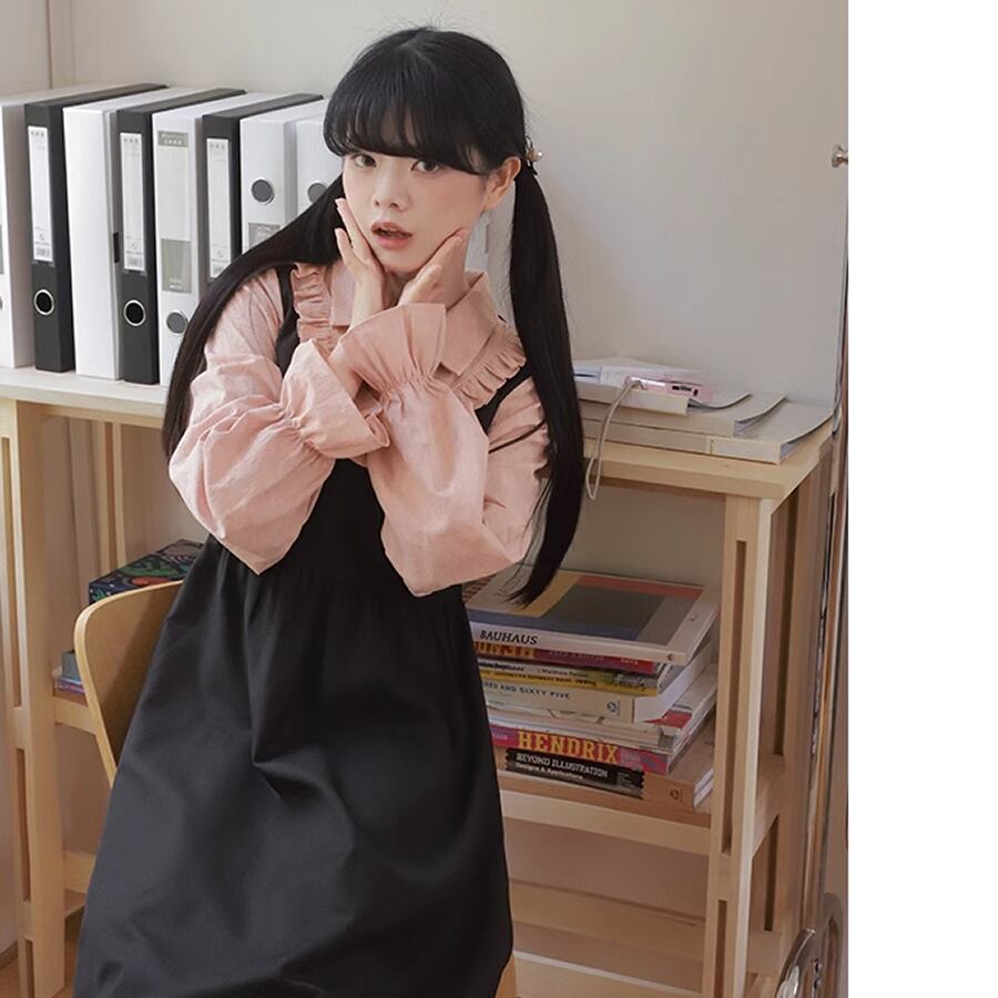 ブラウスとジャンパースカートをレイヤードしたようなデザイン。