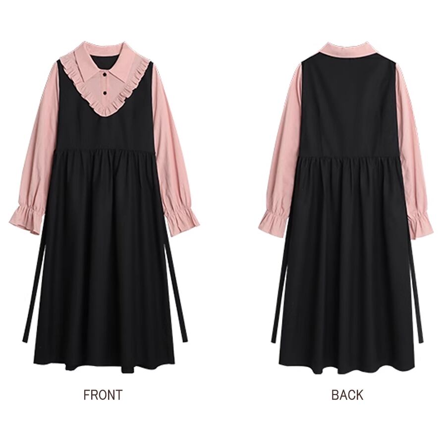 レディース ワンピース ドッキング ロング丈 長袖 フリル S M ピンク AS10839