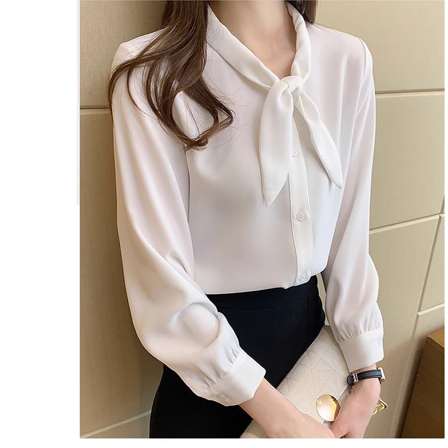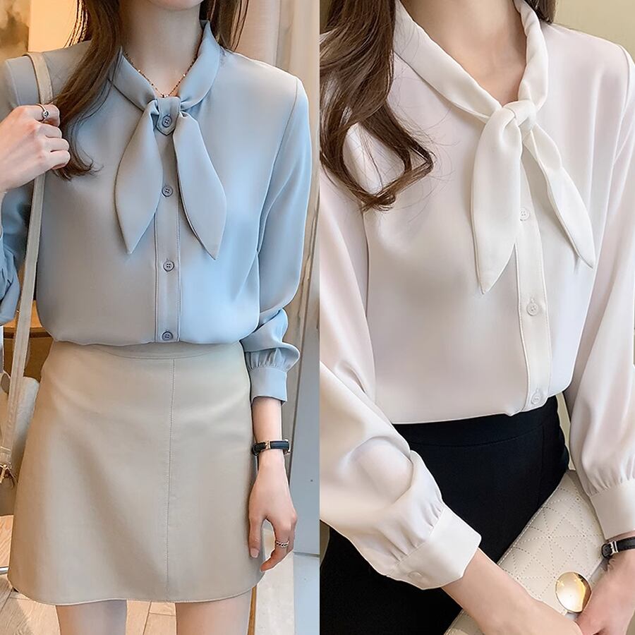 レディース リボンタイ ブラウス 長袖 S M L XL 2XL 白 ホワイト ブルー 青 AS10860