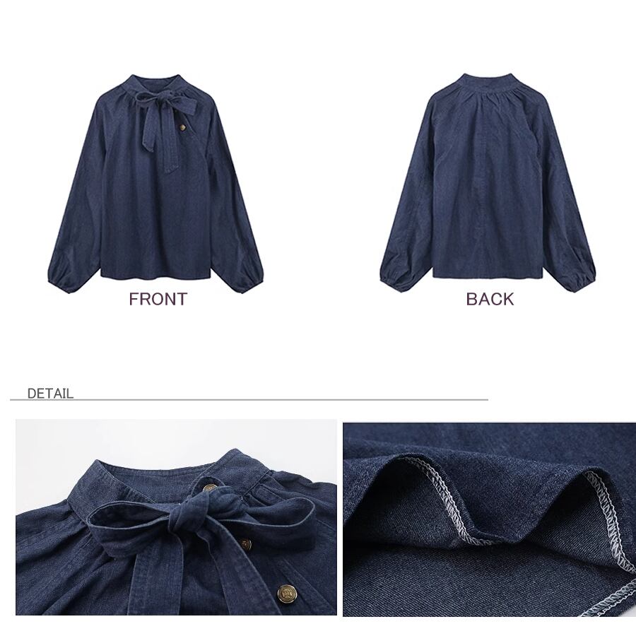 レディース デニム リボン ショート丈 長袖 レトロ シャツ S M L ブルー AS10864