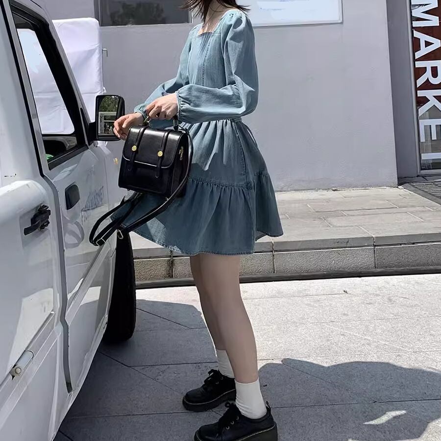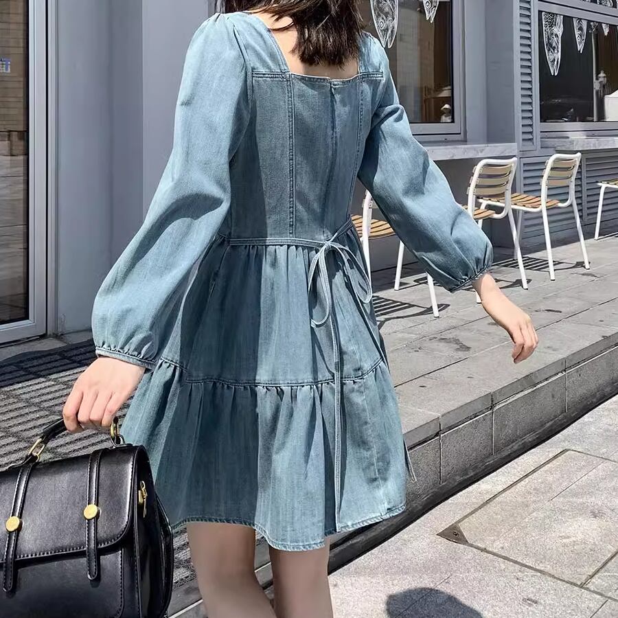 レディース デニム 長袖 ワンピース バックリボン ミニ丈 ハイウエスト XS S ブルー AS10892