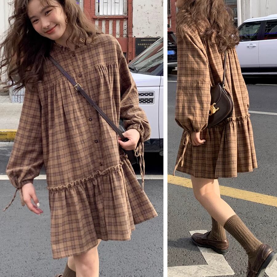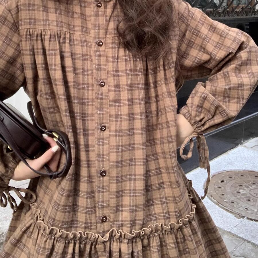 レディース ワンピース チェック柄 ミニ丈 長袖 袖リボン XS S M カーキ AS10894