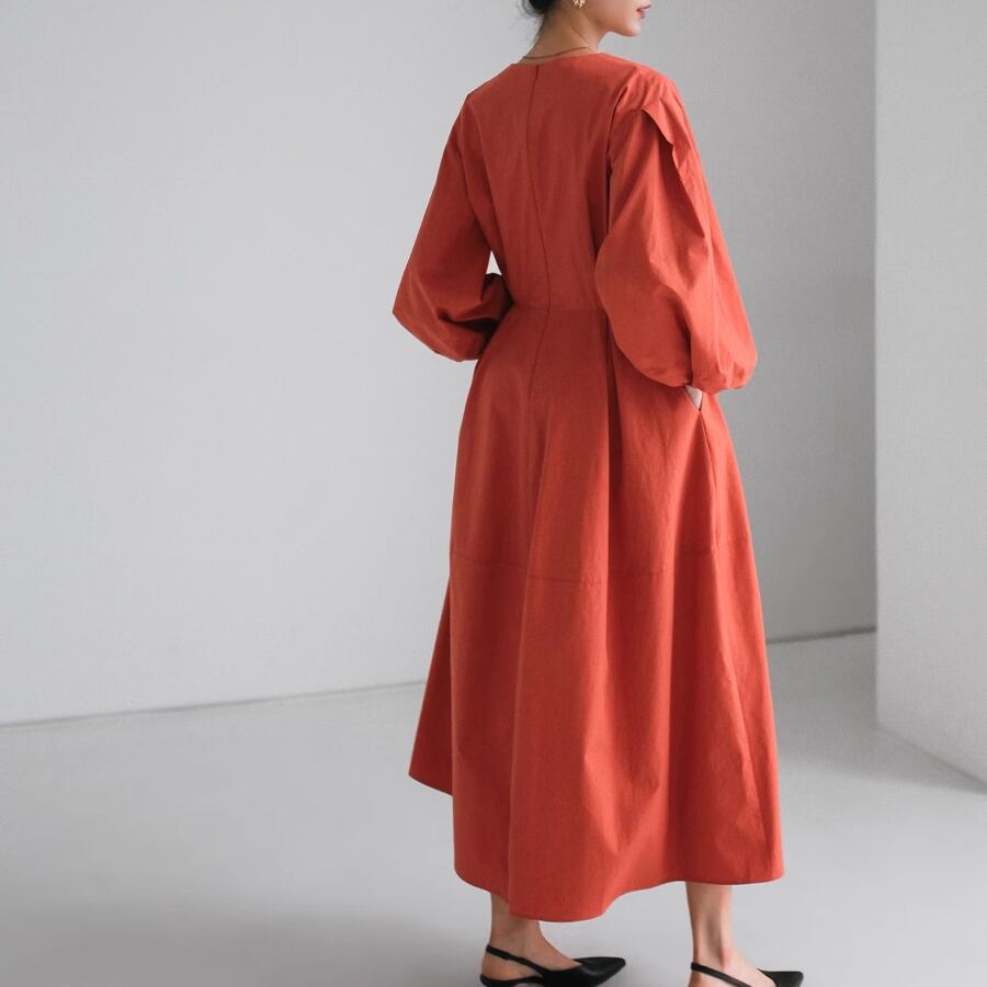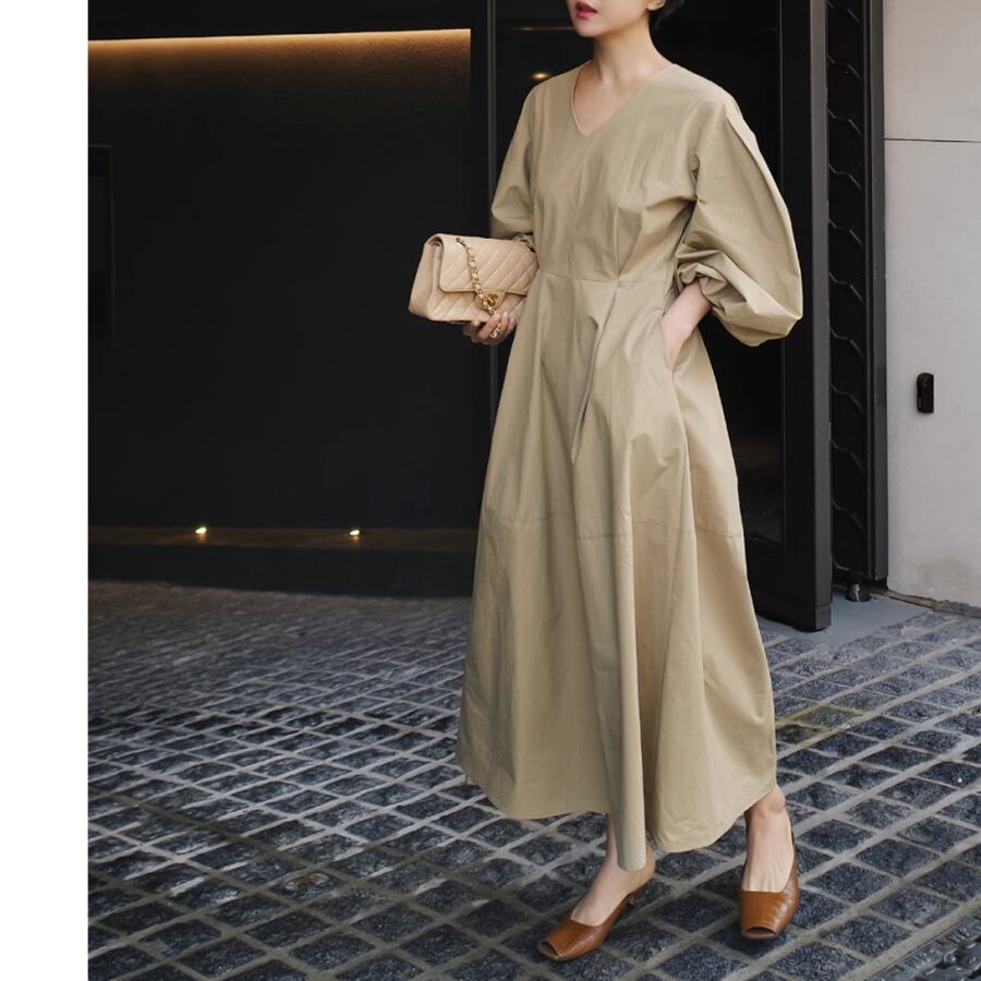 レディース ボリュームスリーブ ワンピース ロング丈 長袖 Vネック オーバーシルエット S M L XL グリーン カーキ ブラック オレンジ AS10909