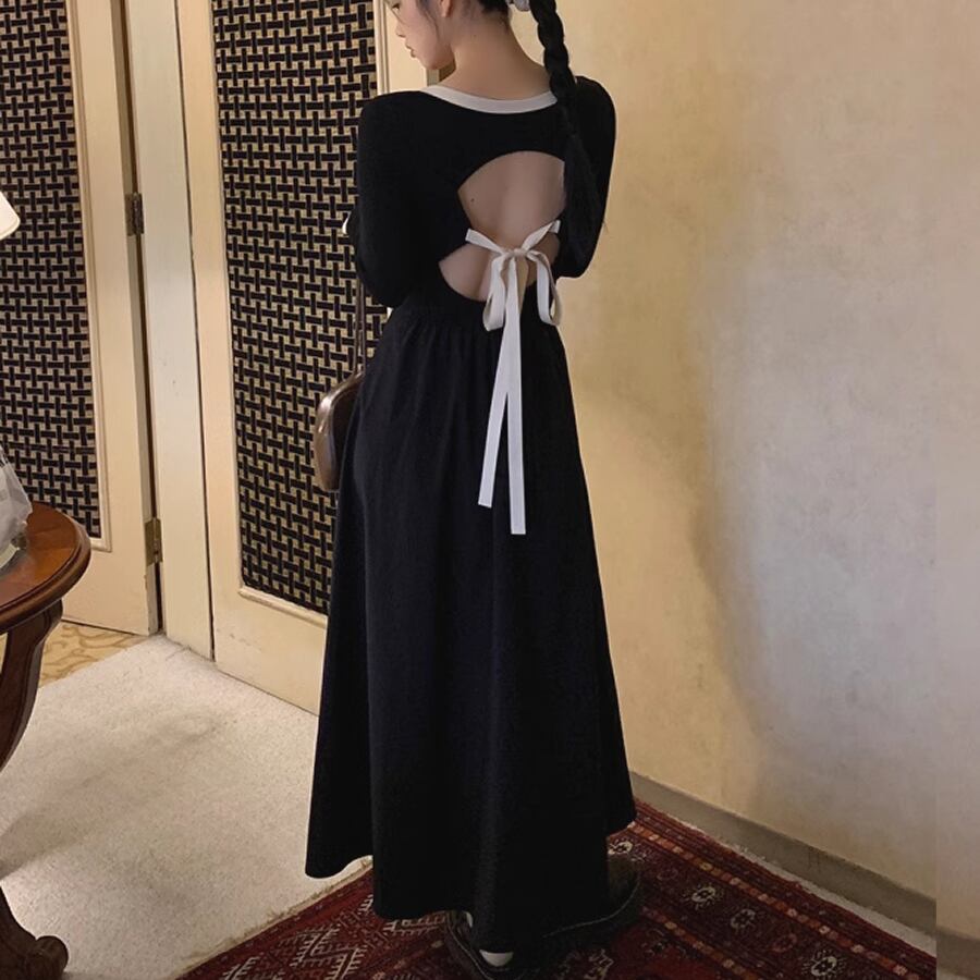 レディース 背中空き ワンピース バックシャン バックリボン 長袖 ロング丈 S M L 黒 ブラック AS10918