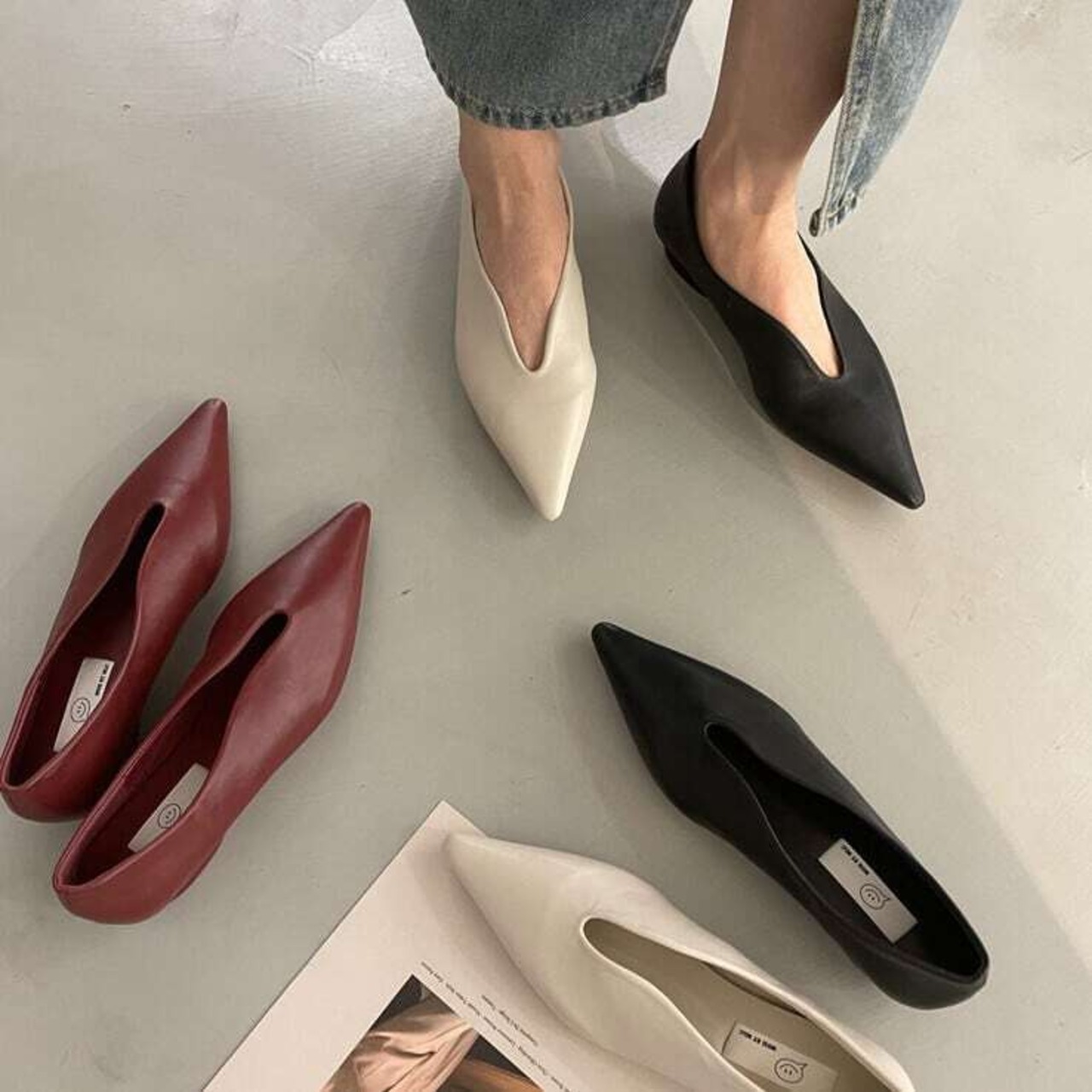 カーブのあるV字にカットされたデザインが印象的なパンプス。少し癖のあるデザインがコーディネートを引き立ててくれます。
