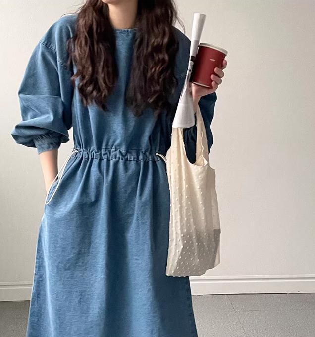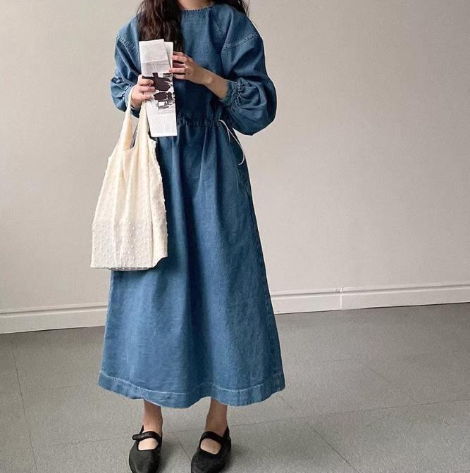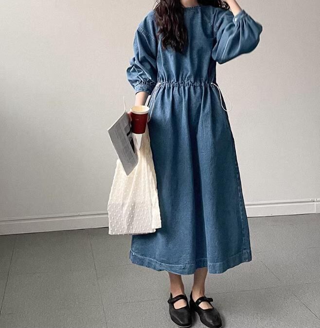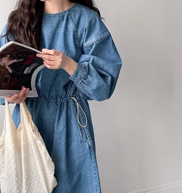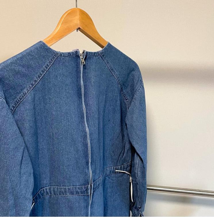 ウエストのドローストリングやパフスリーブで、丸みのあるシルエットが女性らしいデニムワンピース。カジュアルな印象のデニムを、大人可愛く着こなせる一着です。バックジッパー着脱式です。