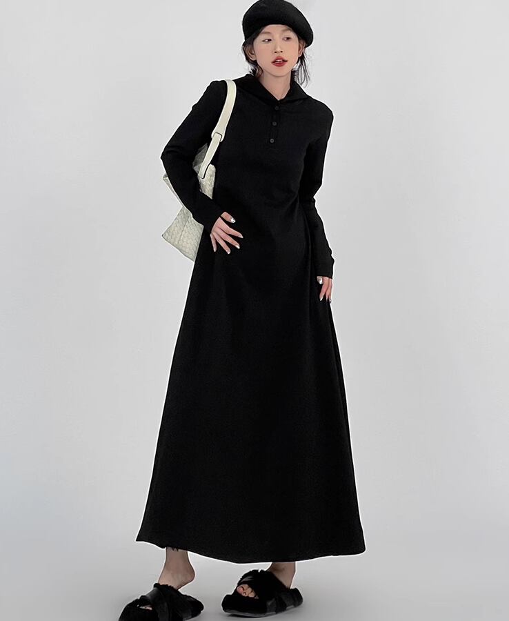 レディース ワンピース フード付き ロング丈 シンプル 長袖 S M L ホワイト ブラック AS10926
