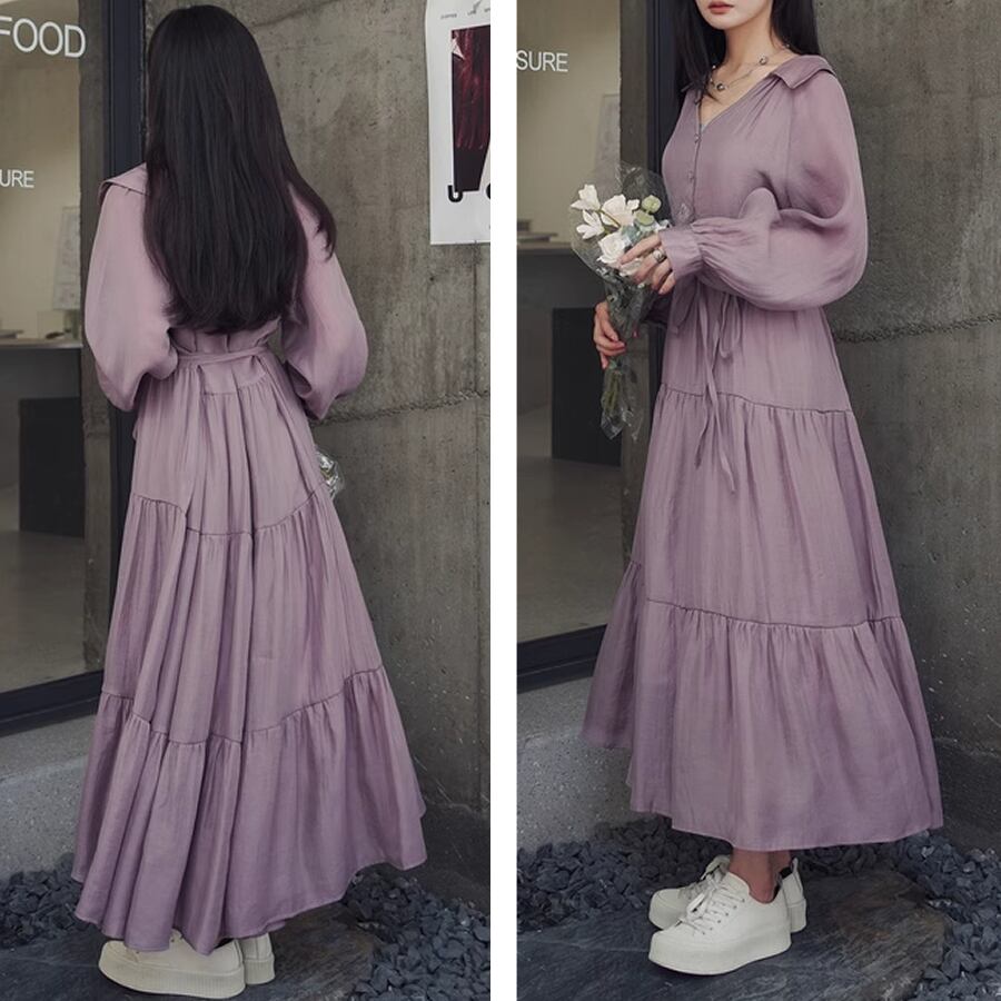 レディース ワンピース Vネック ティアード ロング丈 長袖 春 S M L XL パープル AS10934