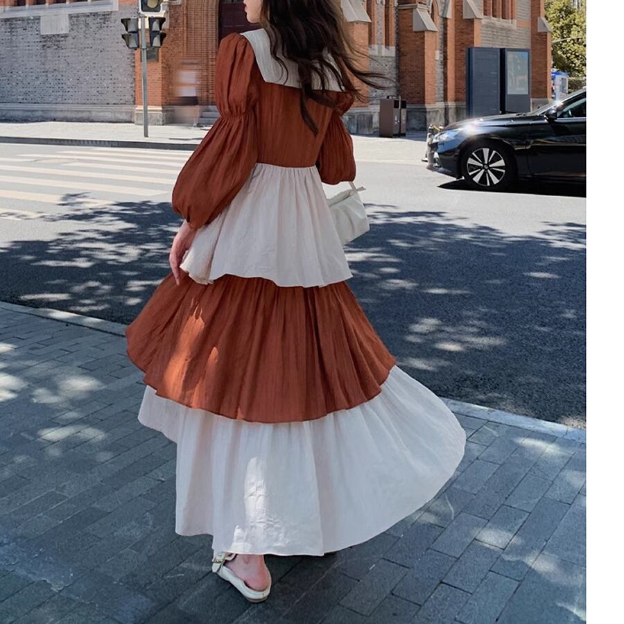 レディース バイカラーフリル ワンピース ティアード ロング丈 長袖 春 S M L XL レトロガーリー AS10935