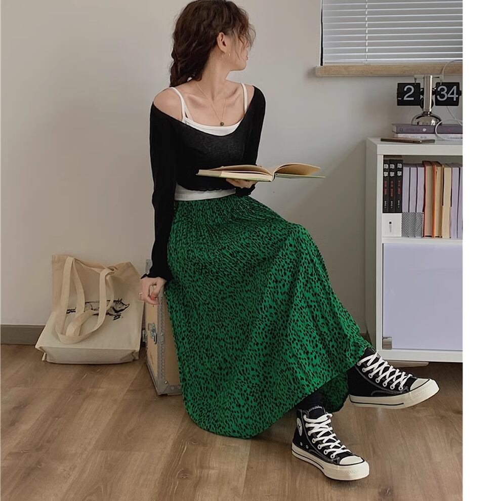 レディース ヒョウ柄 プリーツスカート ロングスカート ハイウエスト レトロ グリーン AS10940
