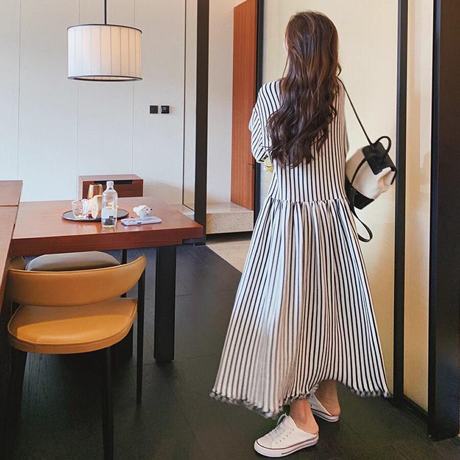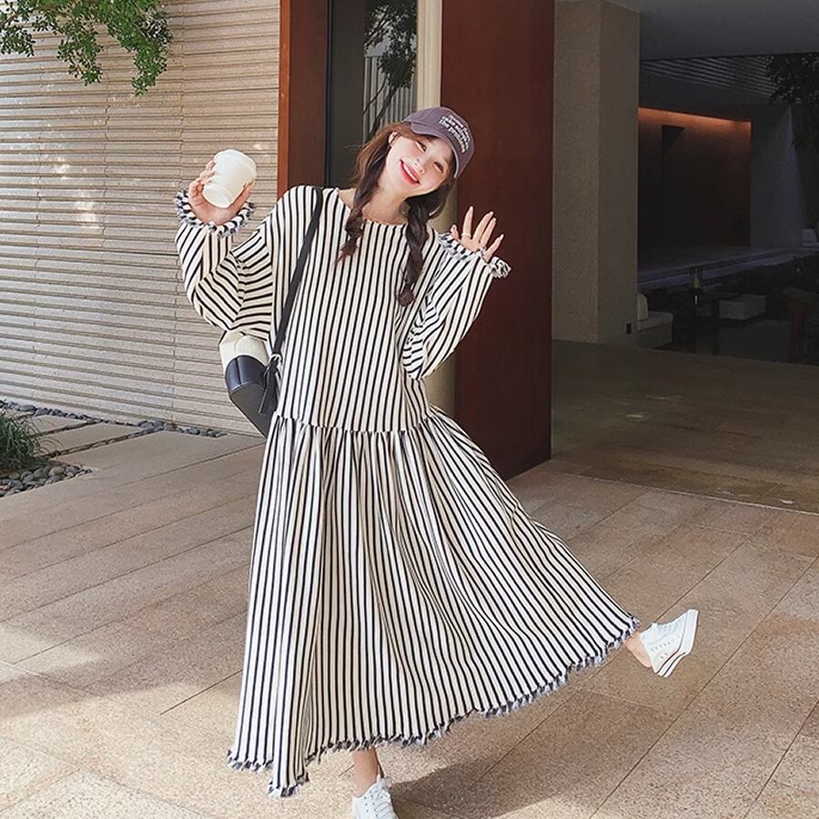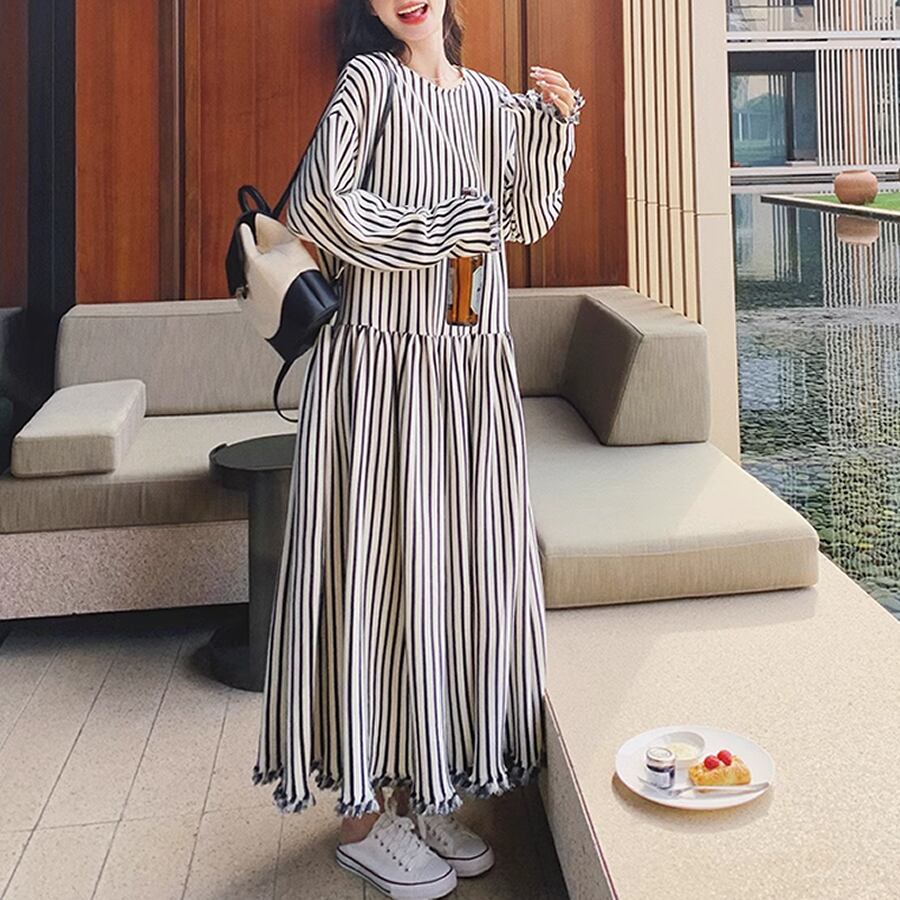 レディース ストライプ柄 ロングワンピース フリンジ 長袖 S M L XL モノトーン 白黒 AS10943