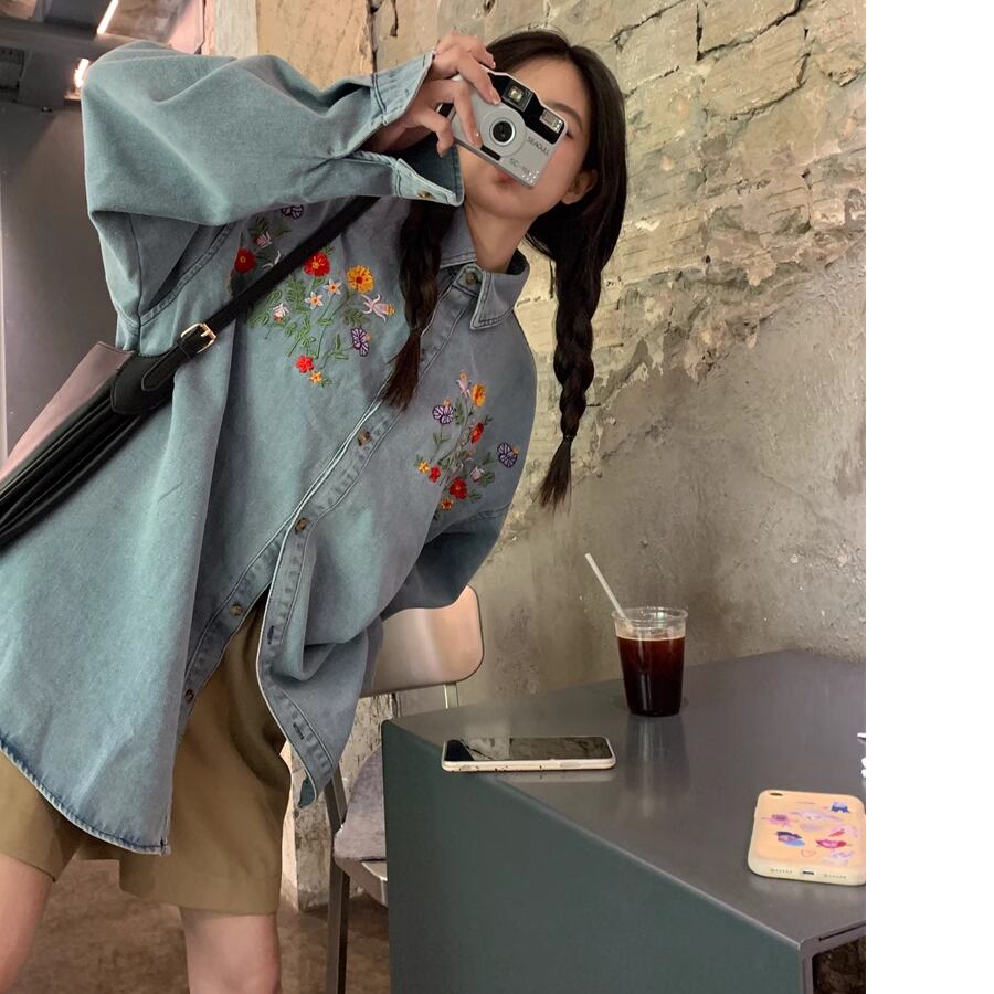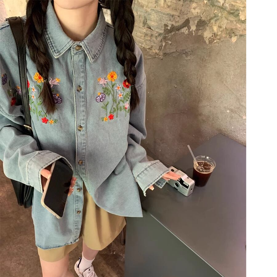 フロントの花柄刺繍がガーリーなデニムシャツ。