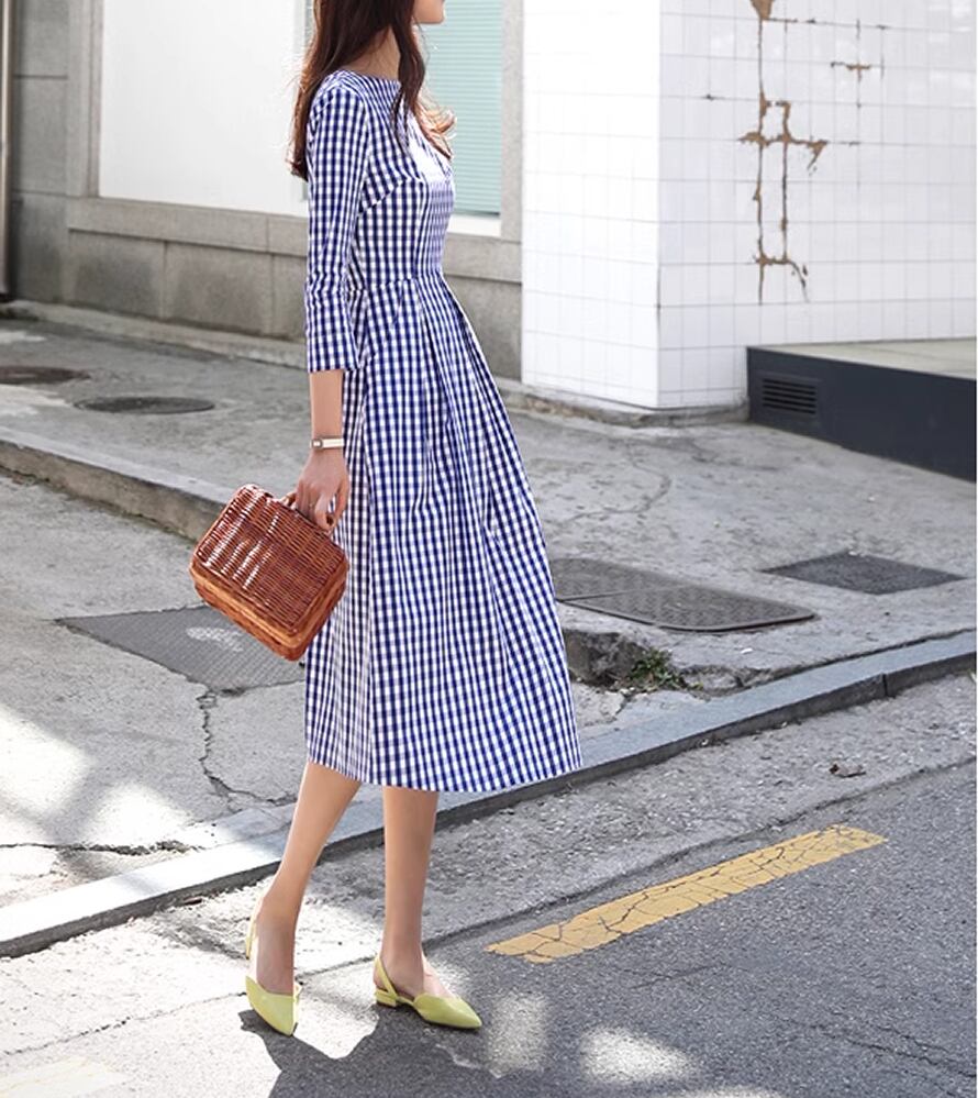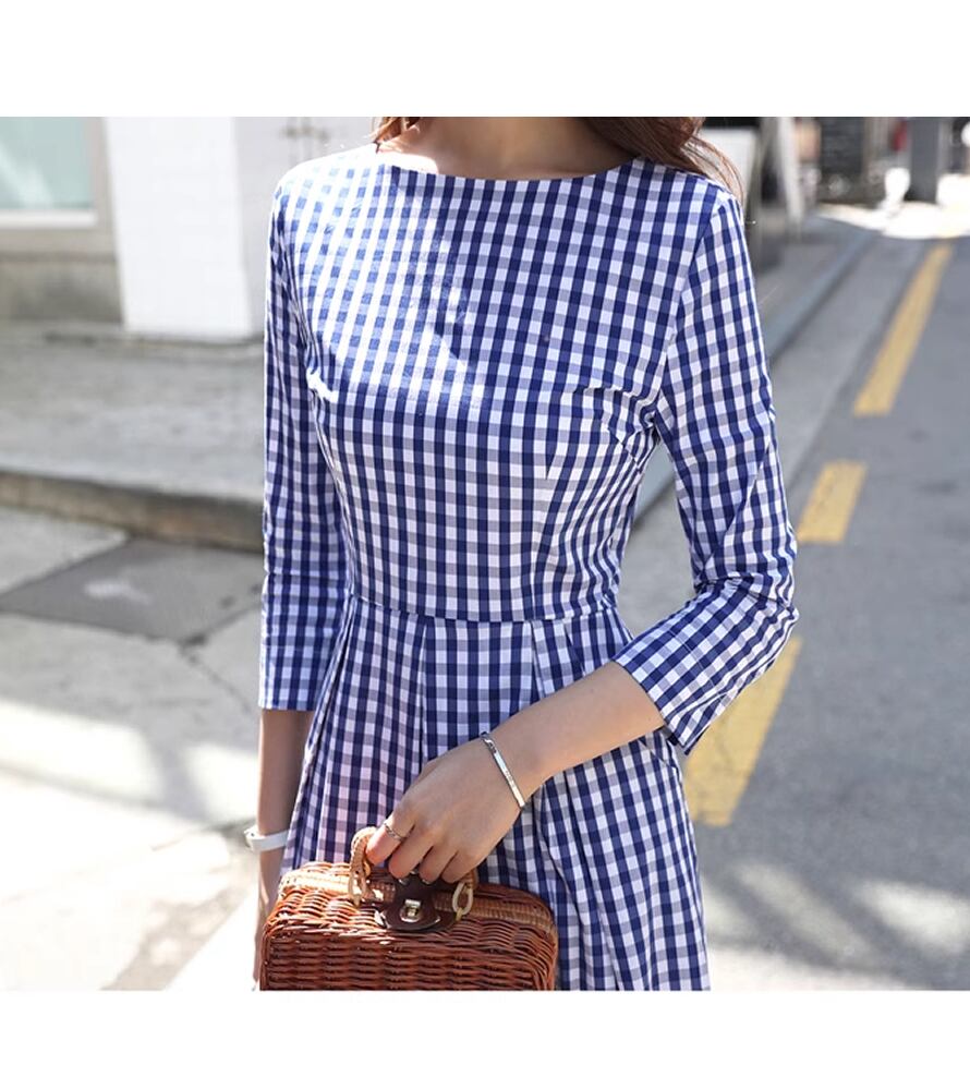 レディース チェック柄 ワンピース 7分袖 ミモレ丈 S M L XL ブルー AS10965
