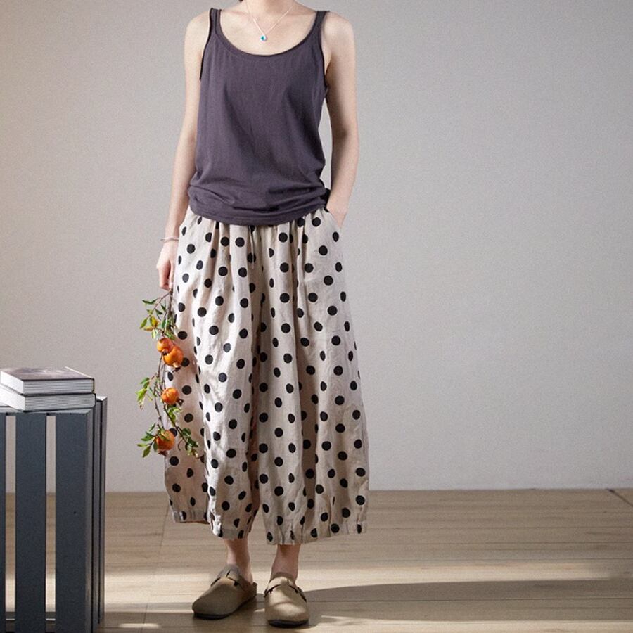 レディース ドット柄 水玉 リネン ワイドパンツ パンツ レトロ M モノトーン 白黒 AS10967