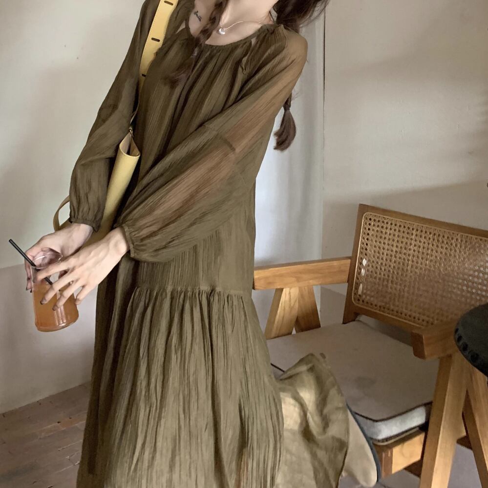 レディース ワンピース 薄手 シアー 透け感 ロング丈 長袖 S M L ブラウン AS10973