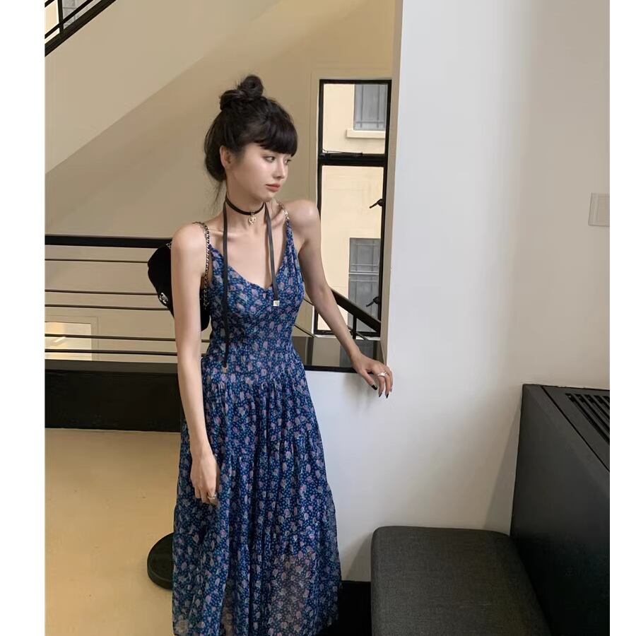 レディース 花柄 キャミソールワンピース ロング丈 レトロ S M ブルー AS10994