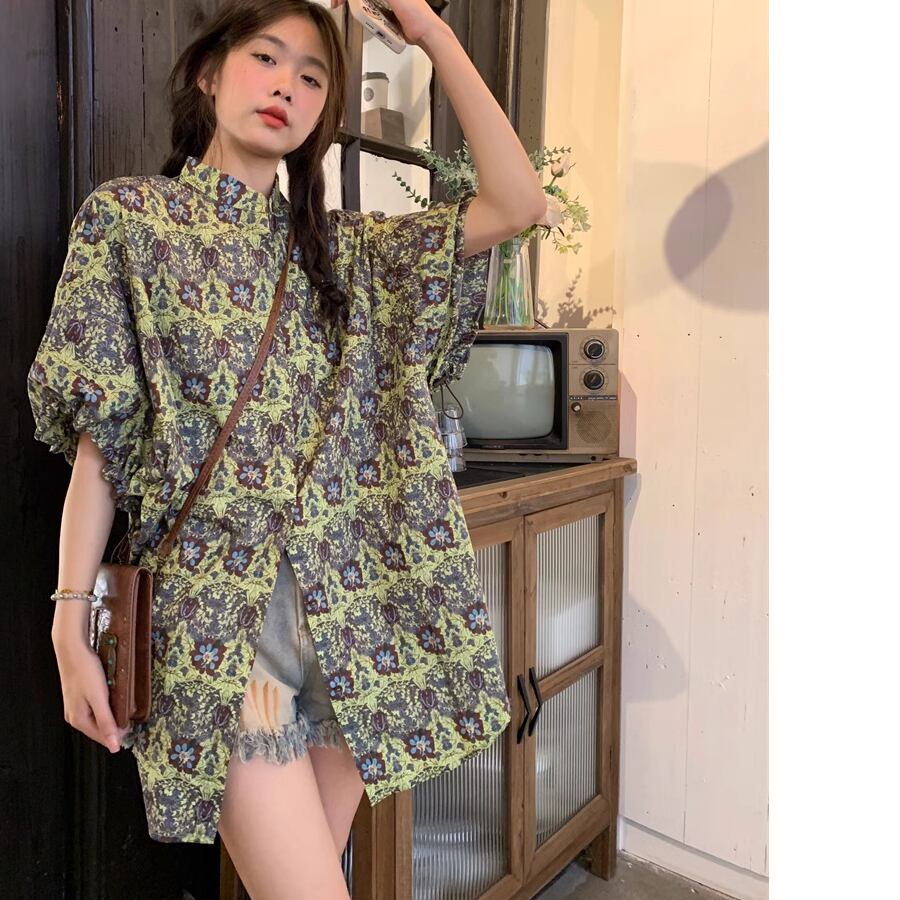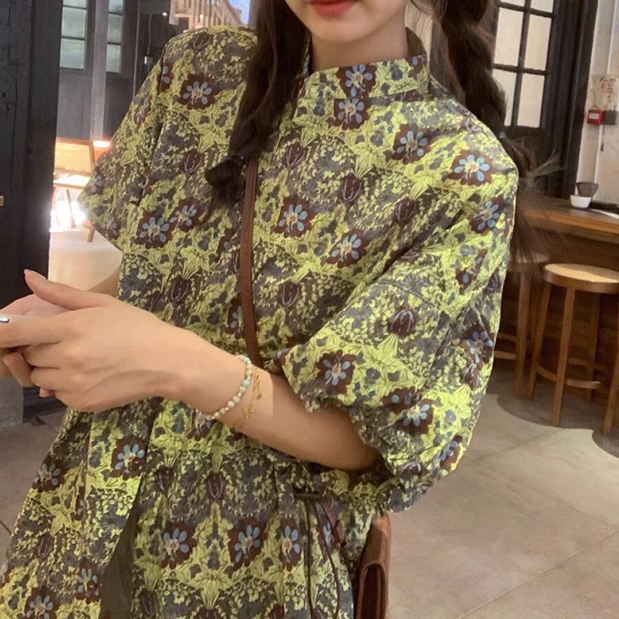 レディース 花柄 ロング丈 半袖 ブラウス S M L グリーン AS11002