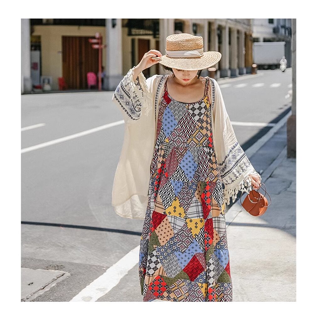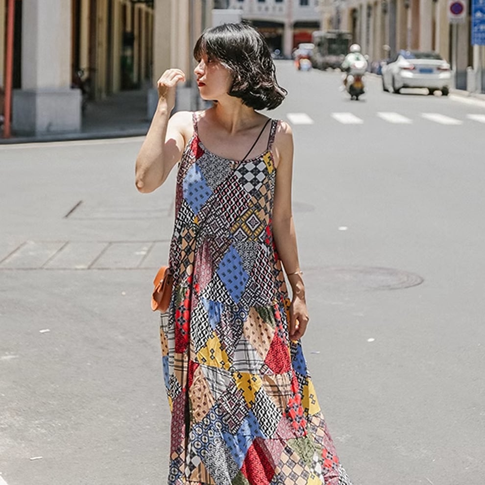 レディース パッチワーク風 キャミソールワンピース ロング丈 カラフル AS11013