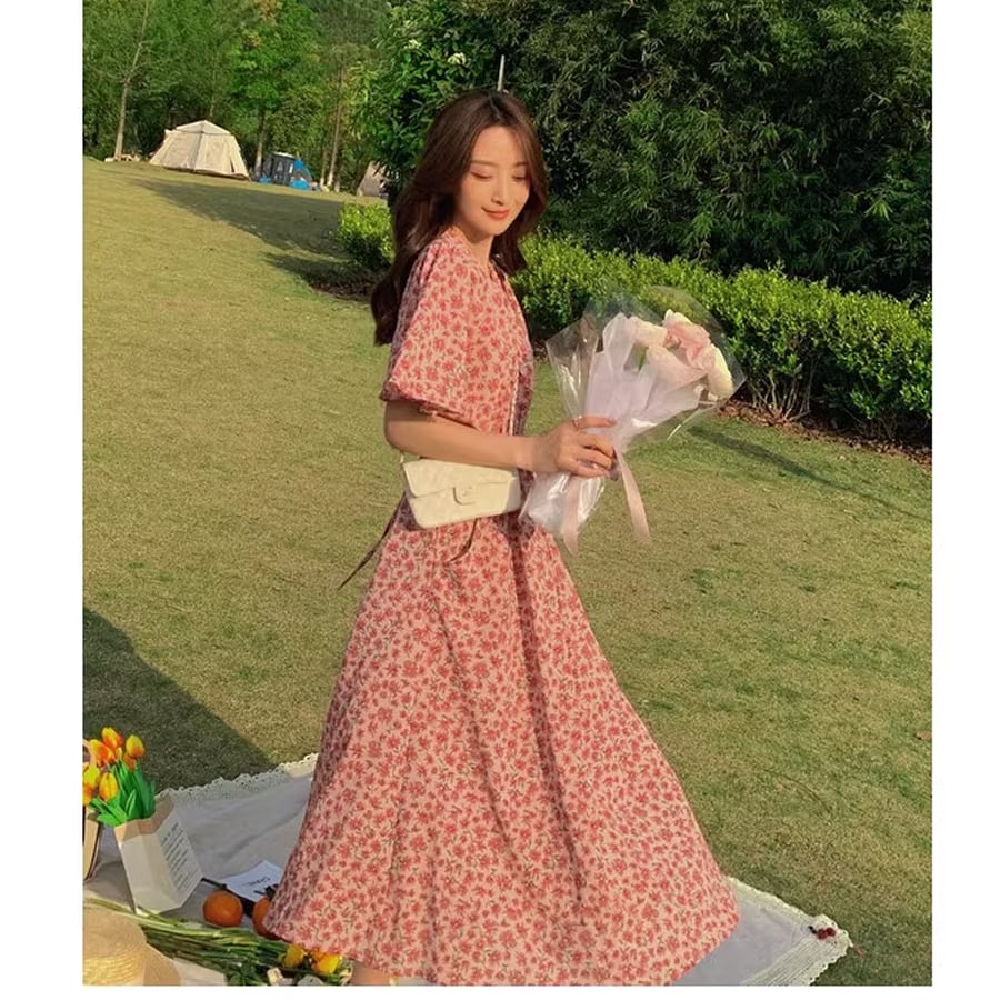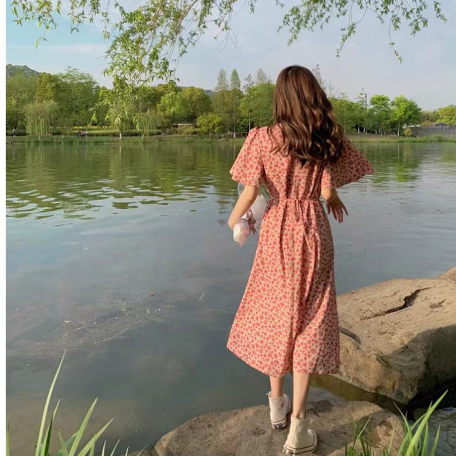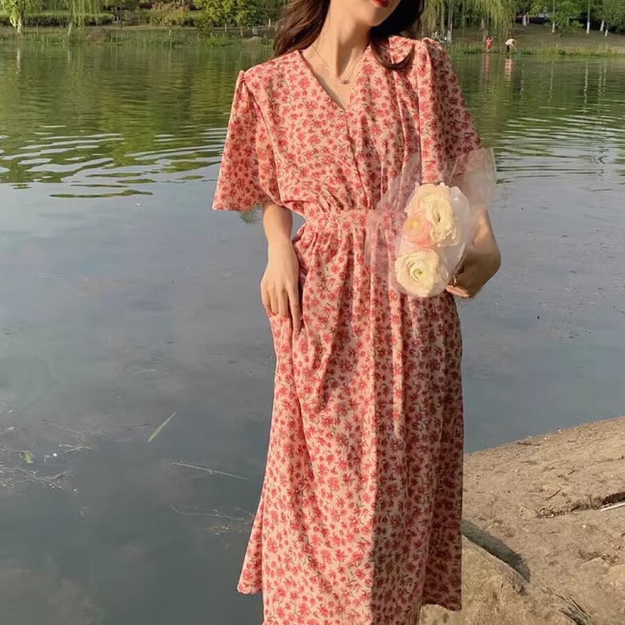 レディース 花柄 ワンピース 半袖 ロング丈 Vネック S M L フレンチレトロ AS11018