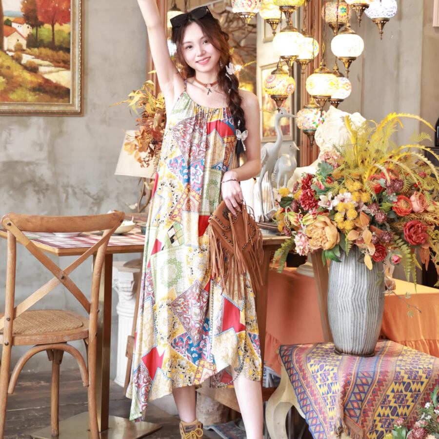レディース ボヘミアン レトロ キャミソールワンピース ロング丈 AS11019