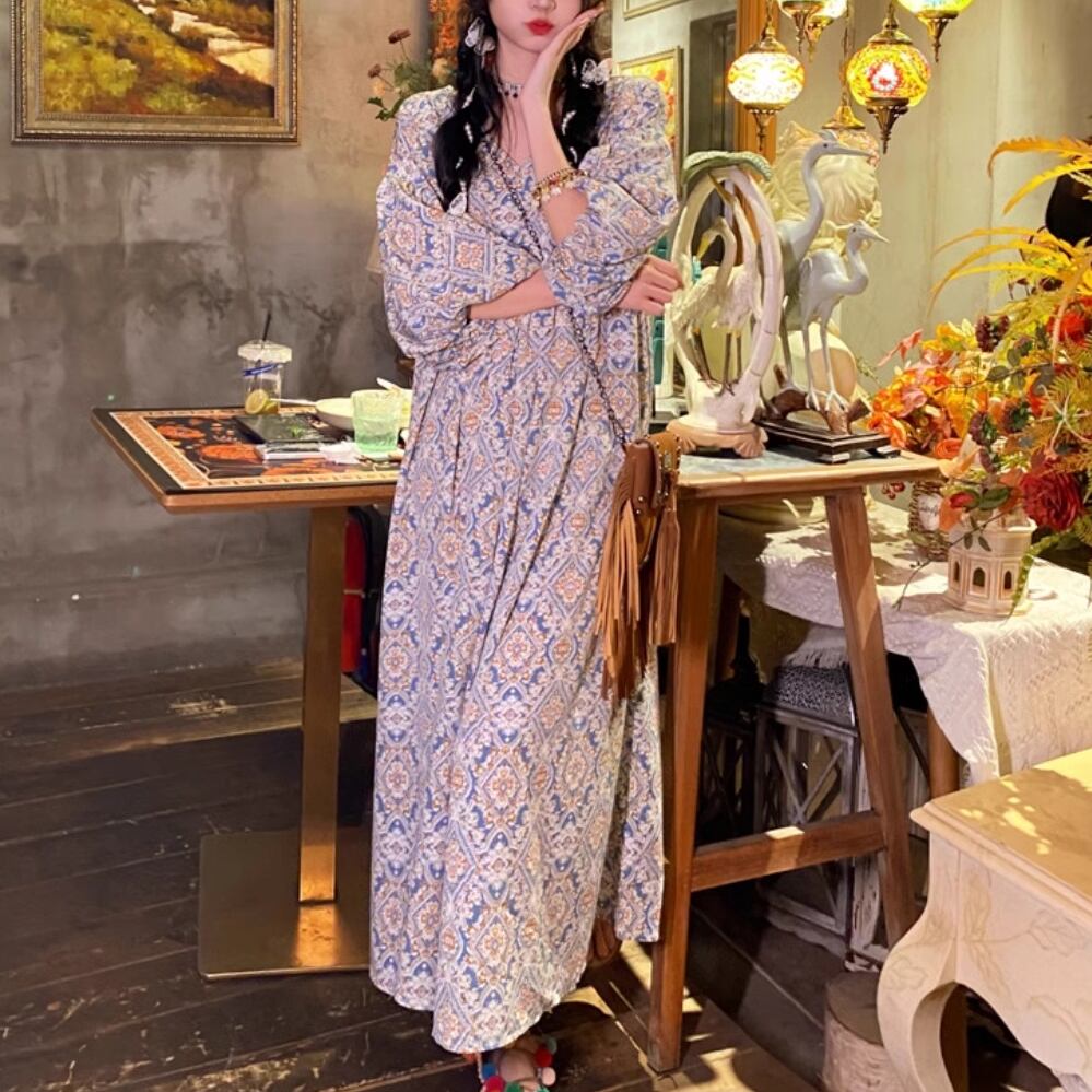 レディース 花柄 ボヘミアン レトロ 5分袖 ワンピース ロング丈 ブルー AS11020