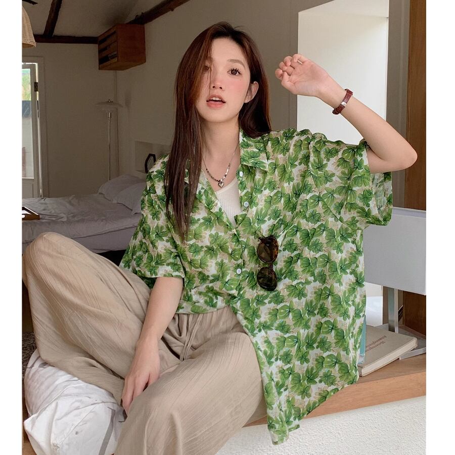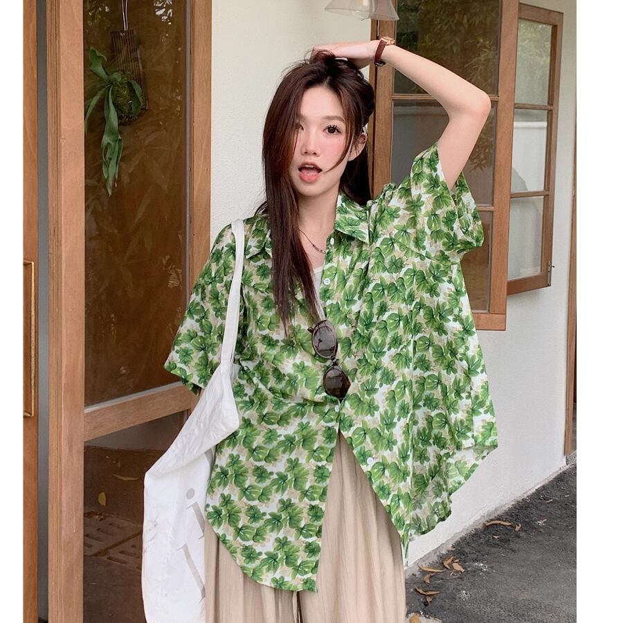 レディース 花柄 シャツ 半袖 オーバーシルエット グリーン ピンク AS11024